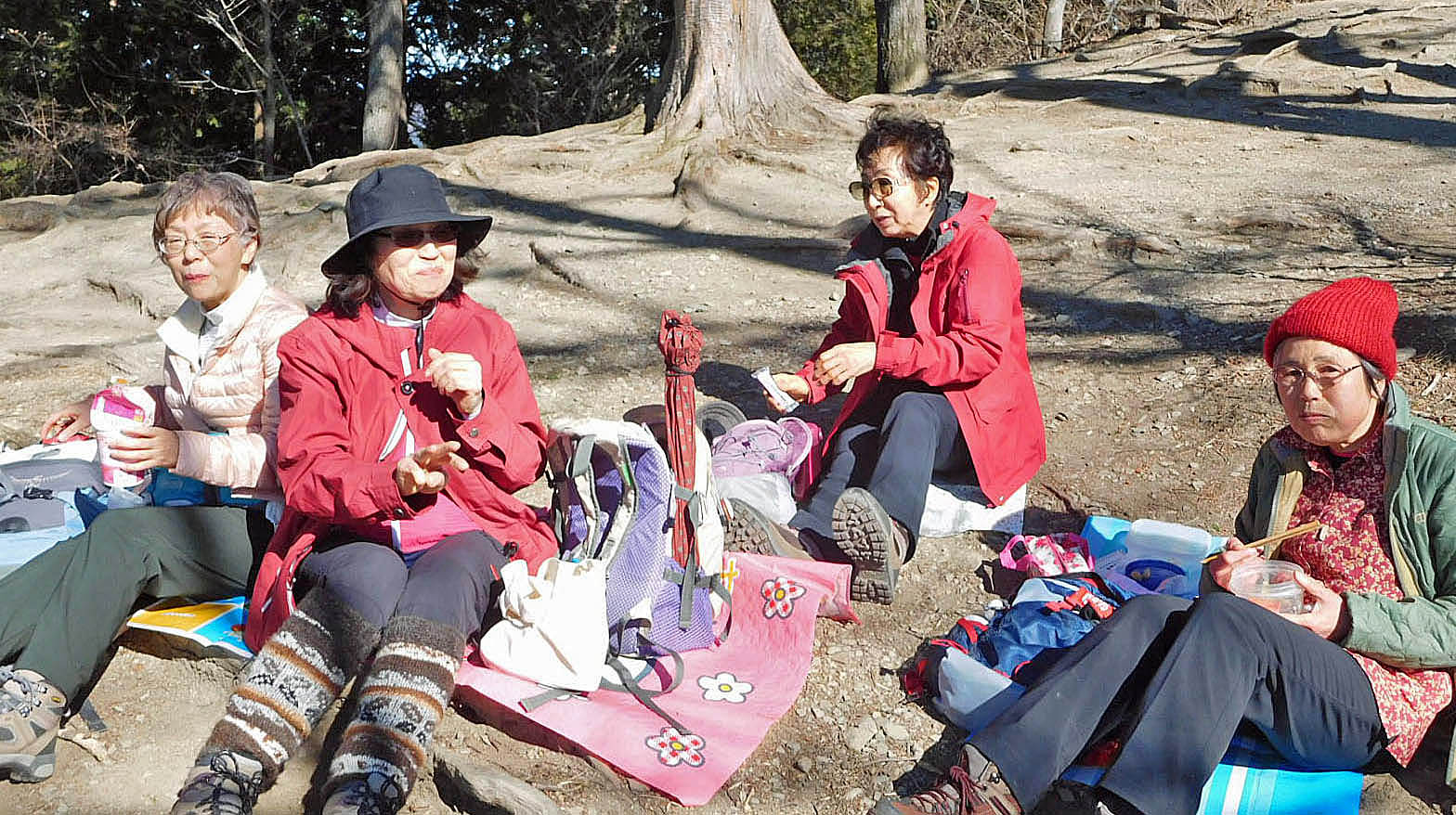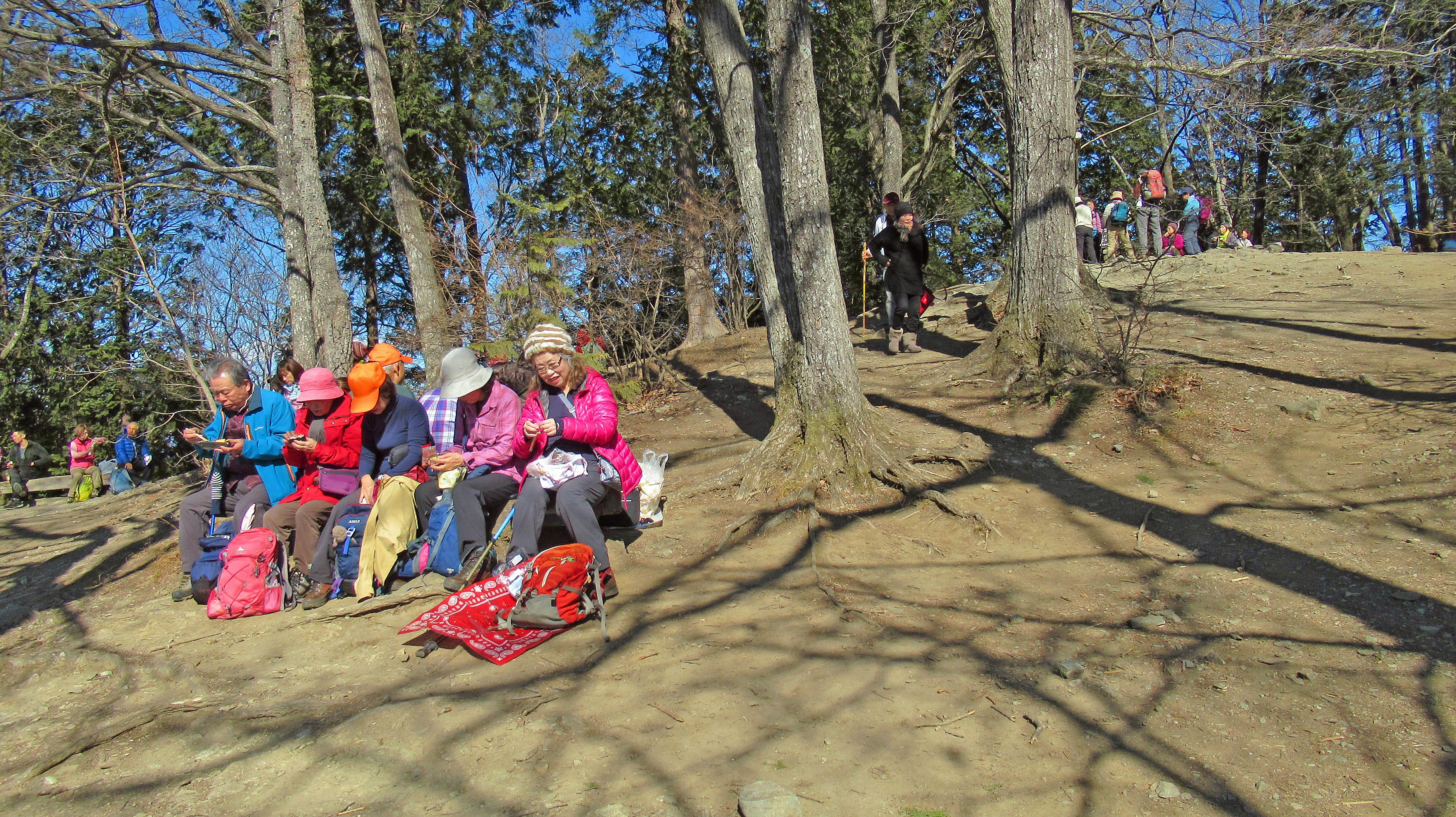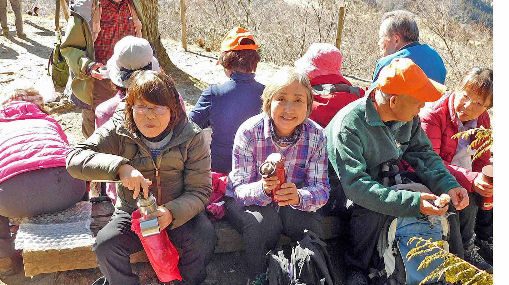 早速、10分程度ロープウェイに乗り終点から宝登山山頂まで、福寿草、紅梅・白梅やロウバイを楽しみながらゆっくりと登り、秩父の山々を眺めながら楽しみの昼食をとった。