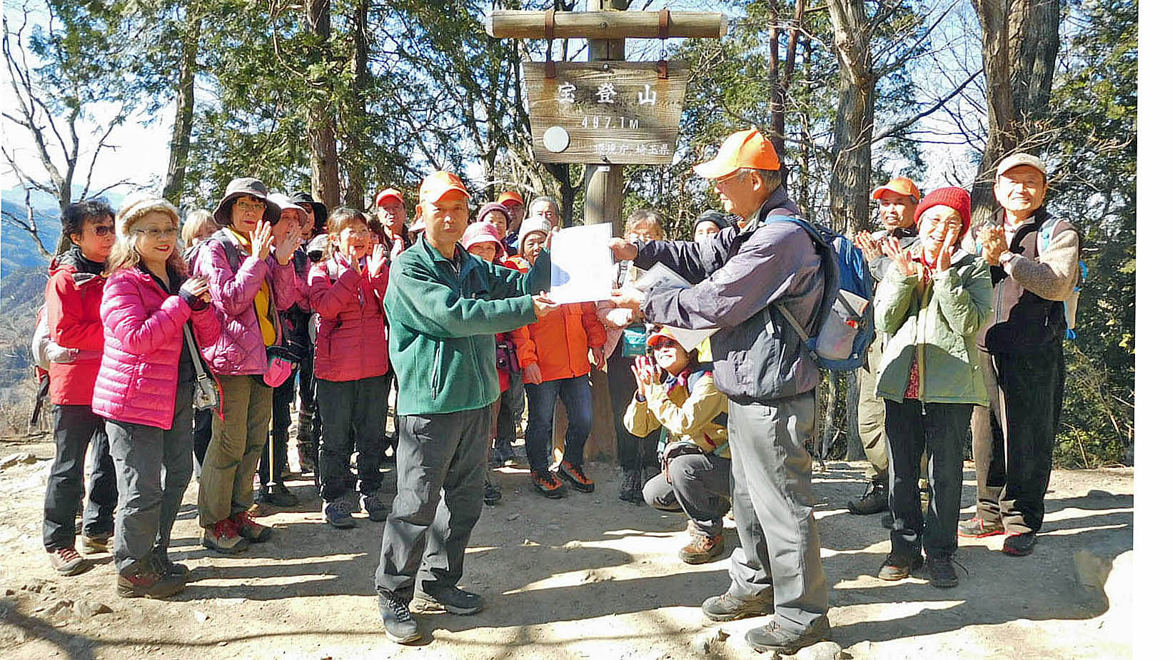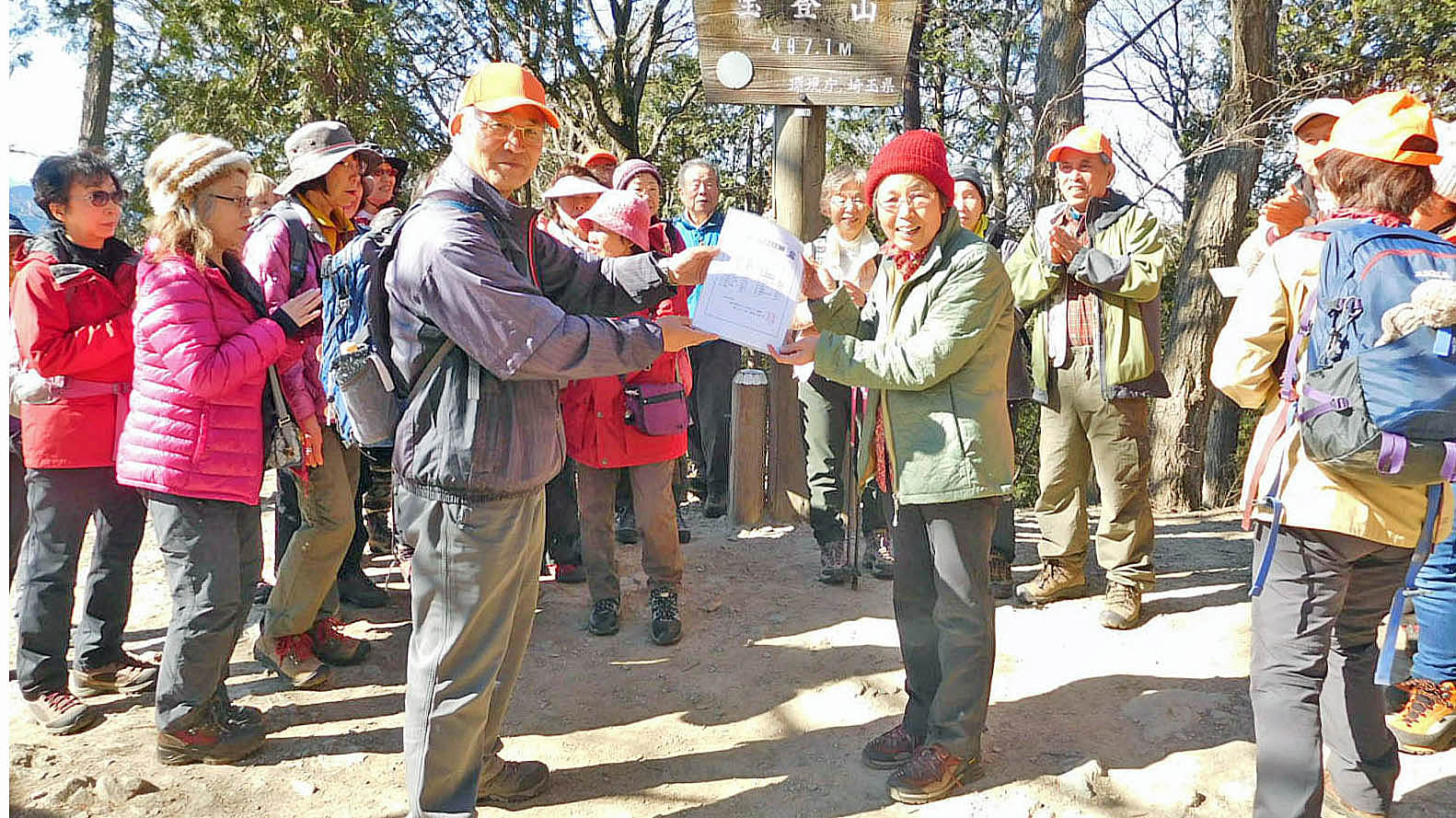 昼食後は、山頂で記念写真と今回で200回参加の元代表井上さんと25回参加の三枝さんの表彰式を行ったが、我々だけではなく多くのハイカーから祝福を受けた。