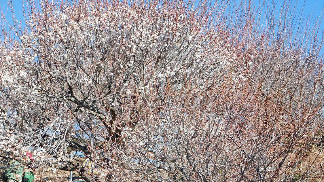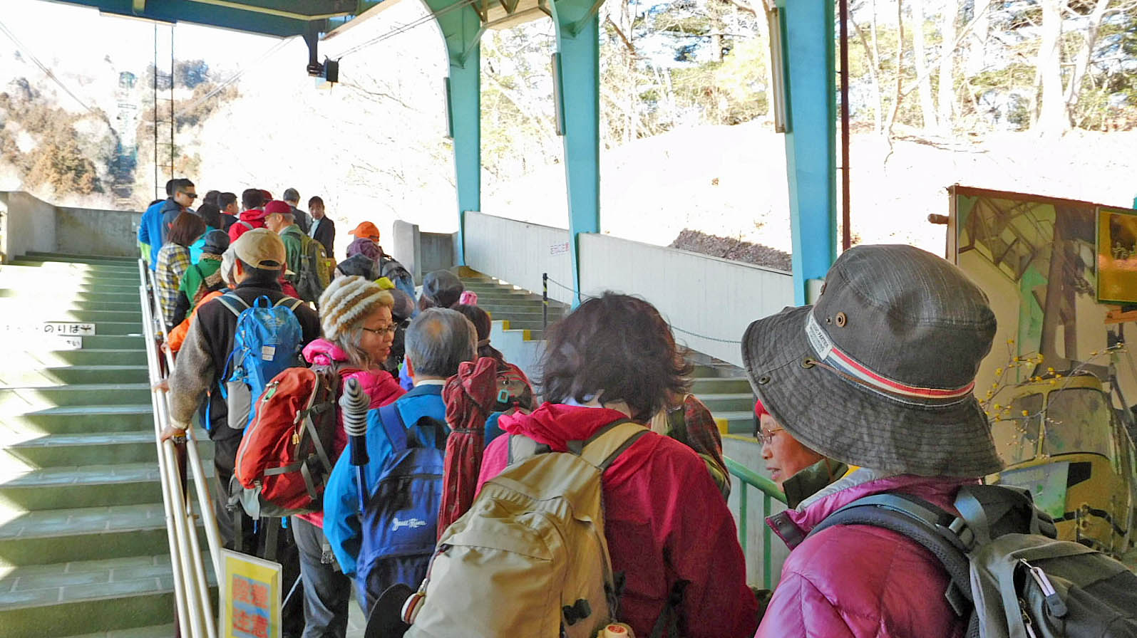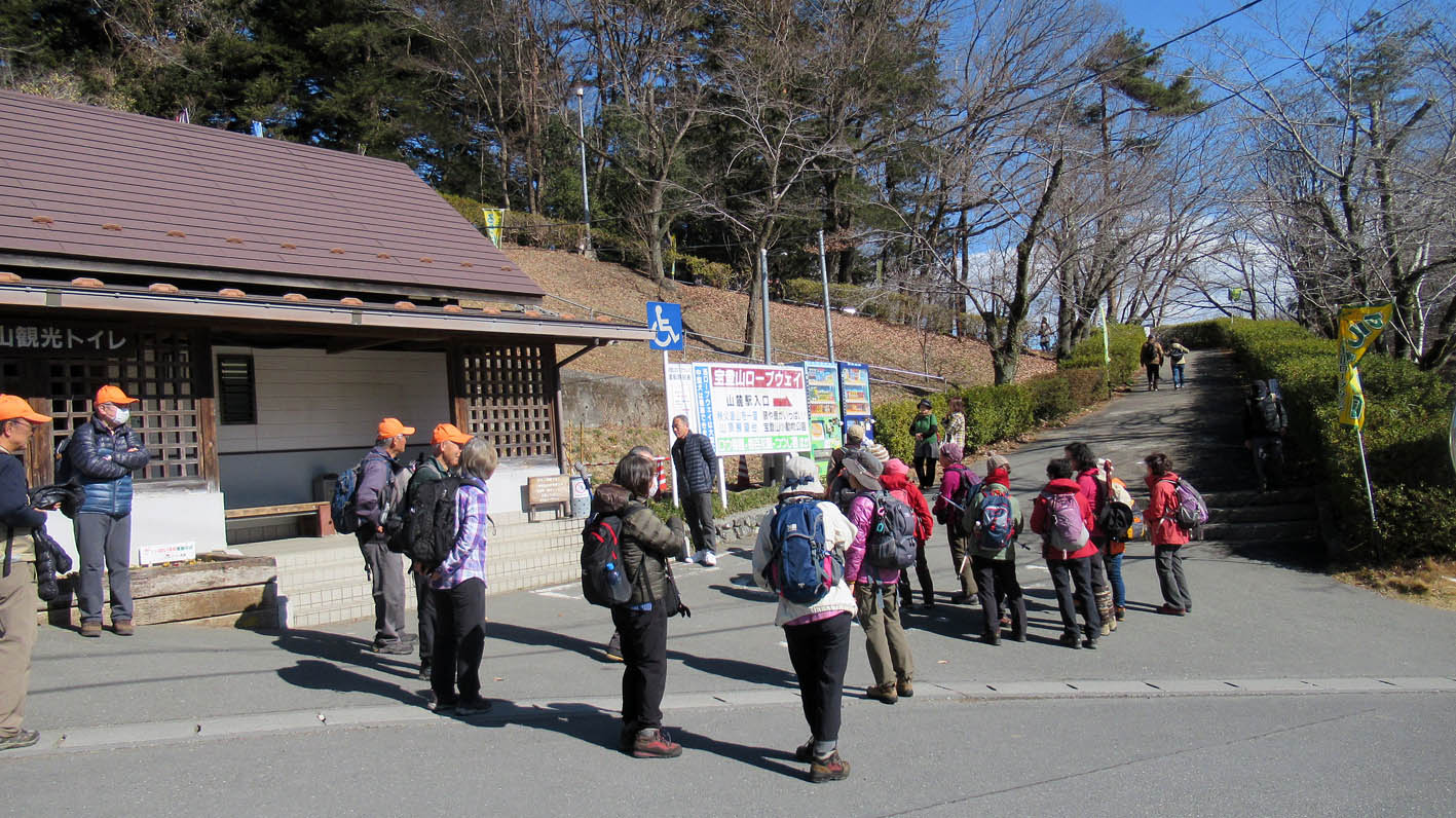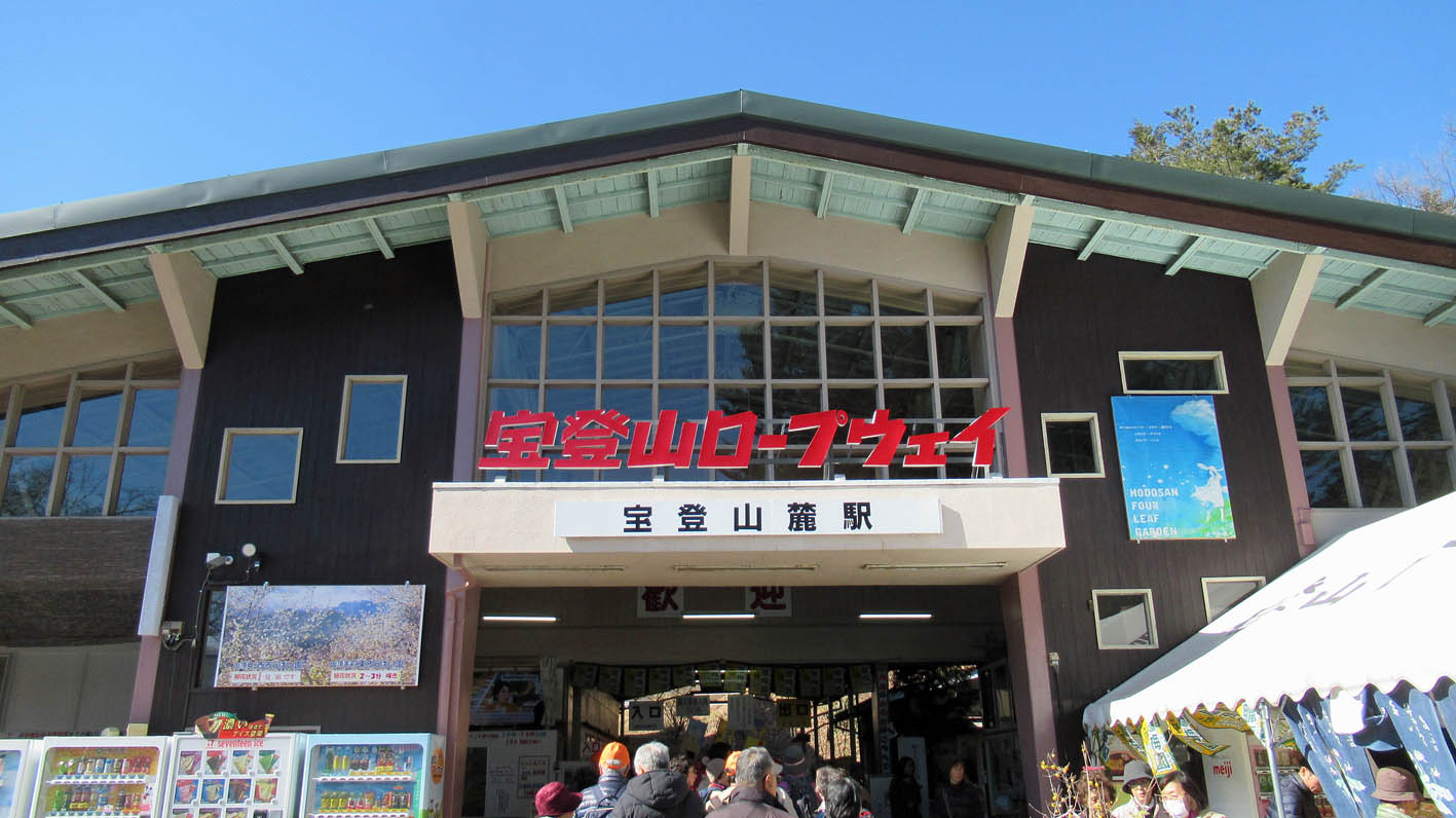 途中佐山SAで休憩をとり目的地である宝登山ロープウェイ下の駐車場に11時過ぎに到着した。天気が良く山全体に雪がないのはやはり温暖化の影響か。