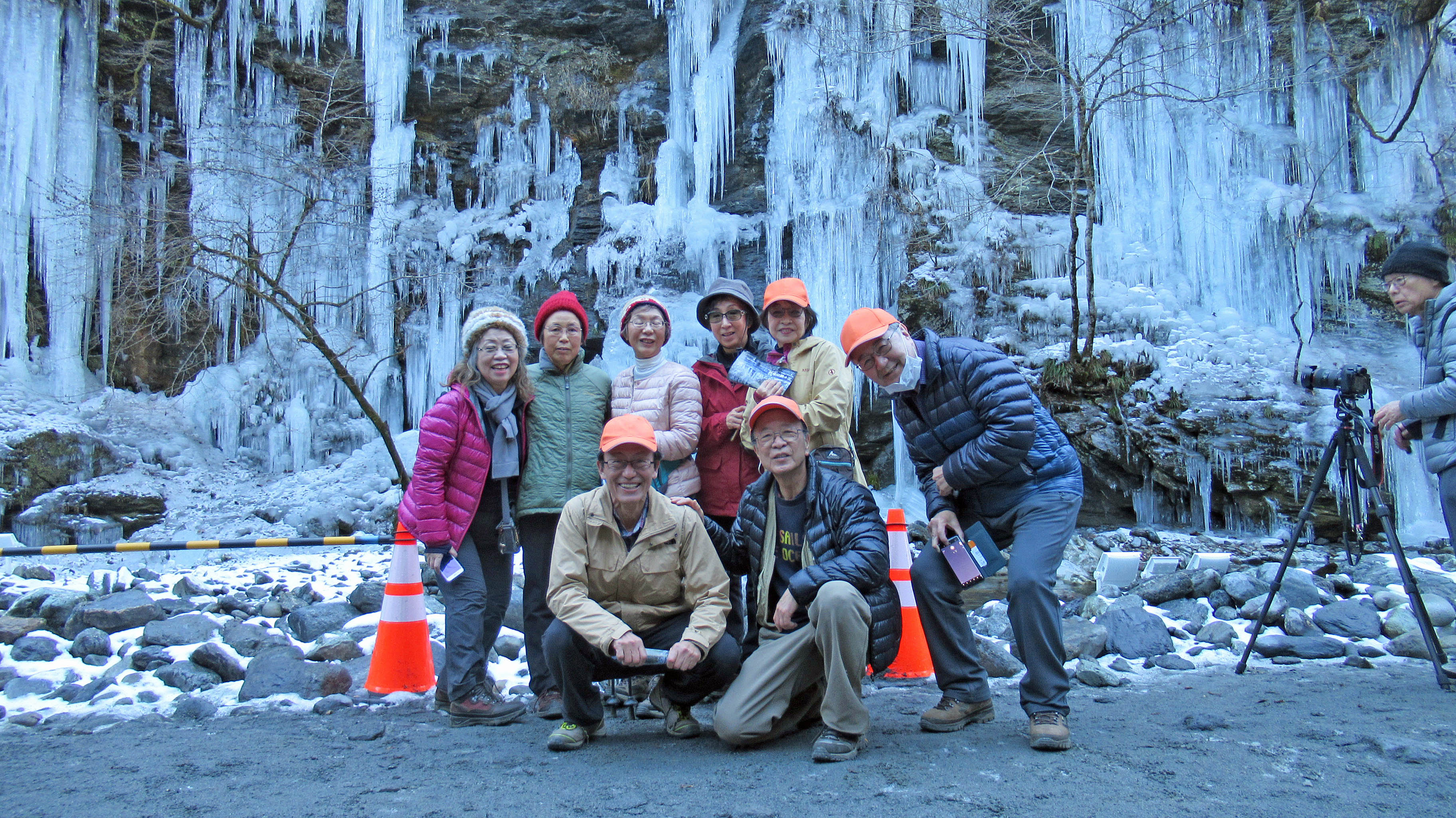 氷柱前で集合写真 |