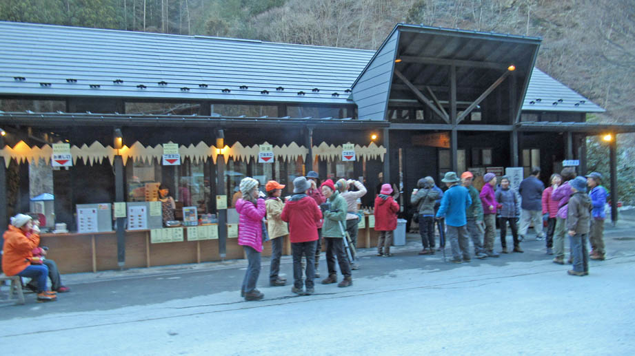 次に、暫らく車を走らせて三十槌の氷柱に行き、温暖化のため氷柱があるか心配だったが、見事な岩清水が凍り創り上げた氷の芸術を見て参加者の皆さんは感激しシャッターを押しまくっていた。ここでも全員集合の記念写真をとり割引の甘酒を飲み名残を惜しんで、次の目的地であるスイーツのフォレストを目指した。スイーツの店では皆さんお買い得の品を多く買い込んでバスに乗り込んでいた。