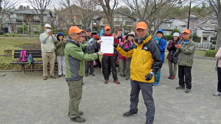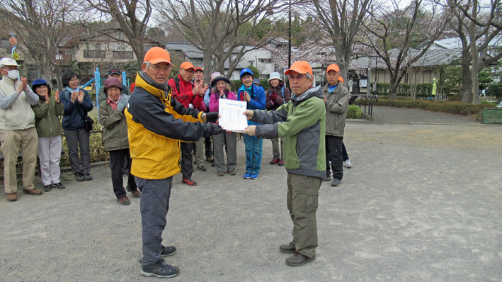 李久保公園での昼食後、参加者全員で伴敏郎会員に通算参加125回参加賞、赤間廣会員に通算参加75回参加賞の授与式を行いました。
