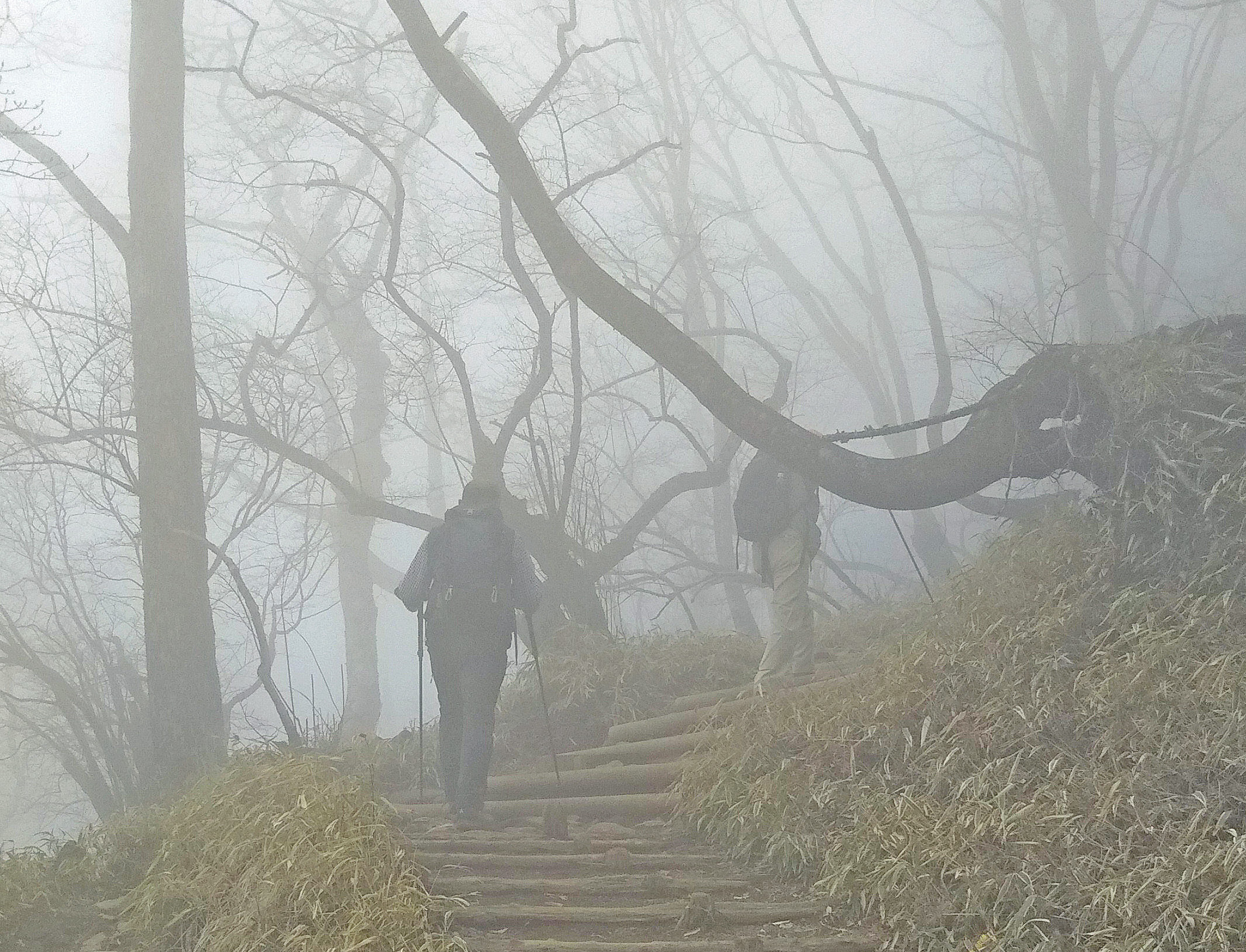 予定通り12時に山頂に到着。晴れていれば富士山、蛭ケ岳、丹沢山の稜線、三ノ塔、大山、湘南海岸等が見え絶景のスポットなのだが霧の為全く見えず。昼食を取るも寒さが堪える(下界は20度以上)。早々に下山開始。