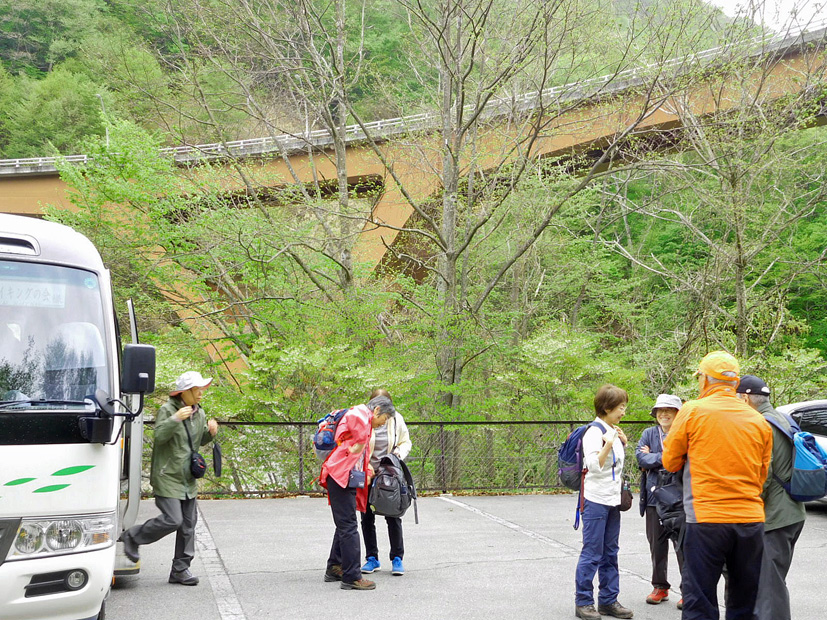 特に、沢を遡るため、雨の依る増水が一番危険で、気になっていました。勝沼インターを経て山梨・西沢渓谷入口の駐車場着、10時過ぎ着。前日からの雨空を考え、沢筋の増水が十分予想されるため、最終的に、幹事で相談し、予定コースは中止し、雨の影響が少ない林道を一時間程、新緑の径を歩くことにしました。