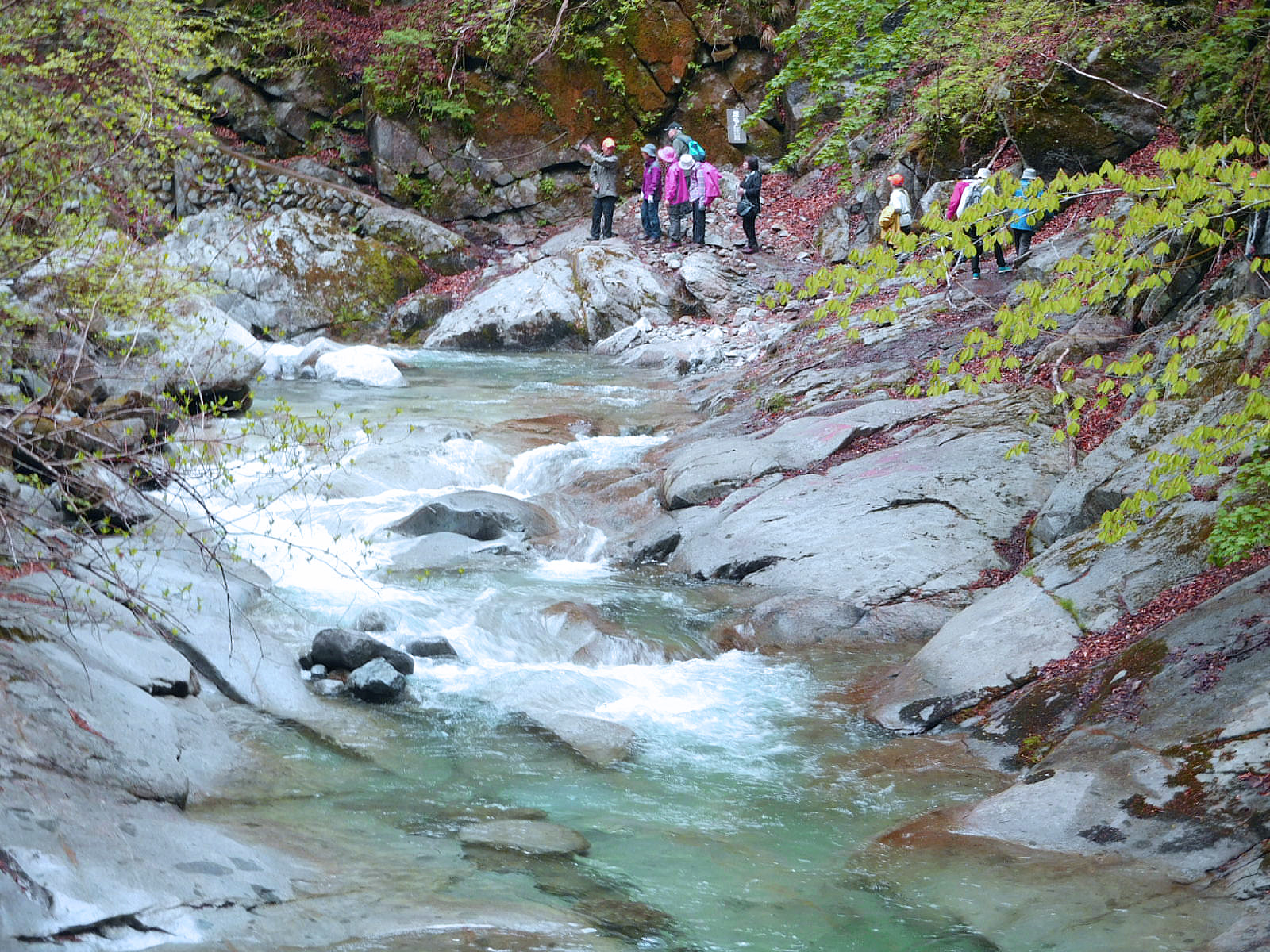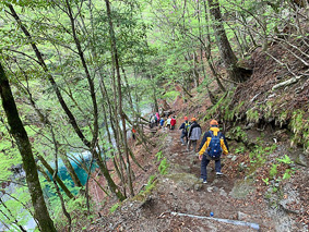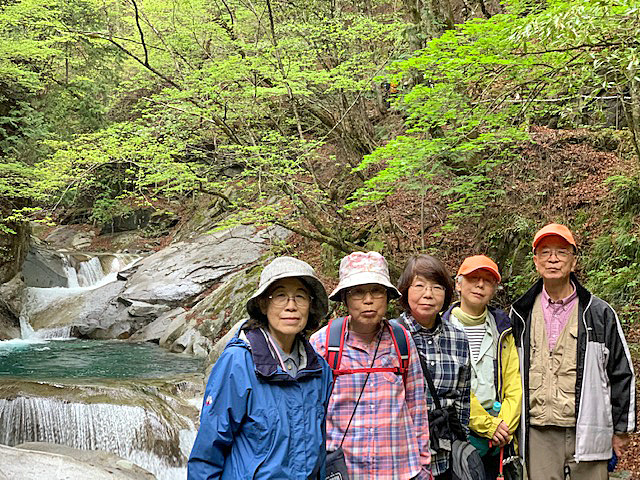 多少、予定時間を延ばして、「三重の滝」迄、往復する事が出来ました。真っ青色の滝と 秩父特有な花崗岩の白い滑状の岩と飛沫を上げる渓流見ることができ、一同、満足でした。(圧巻の七ツ釜五段の滝迄は、行けませんでしたが)