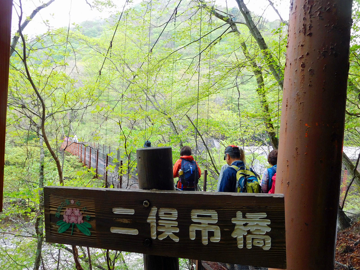 幸い、歩き始め始める頃、雨を止み、駐車場から予定コースに入り、ナレイ沢広場、西沢山荘先の「田部重治の顕彰碑」を過ぎ、二股の吊橋を渡り、西沢渓谷の立派な表示板で全員で写真撮影、この間、林道は、見事な新緑で、歓声の声が上がっていました。