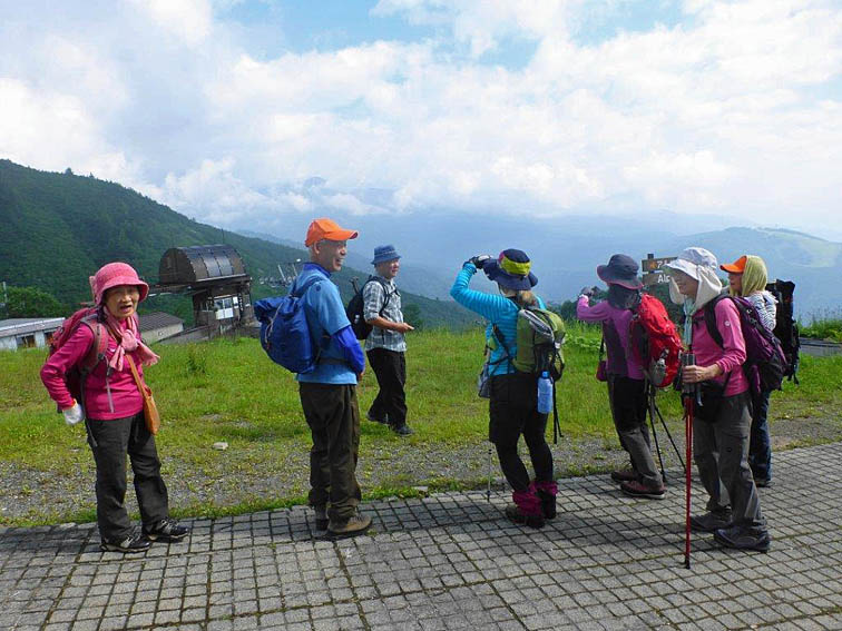 30日(晴)は、宿から八方ゴンドラ駅まで歩き,ゴンドラとリフトを2回乗り継ぎ、終点・八方山荘前着。ストレッチ体操後、9:20出発。ハイシーズンの為老いも若きも、大勢の人々の行列状態で、霧がかり、展望はなかったものの、時折、涼しい風で心地良かった。