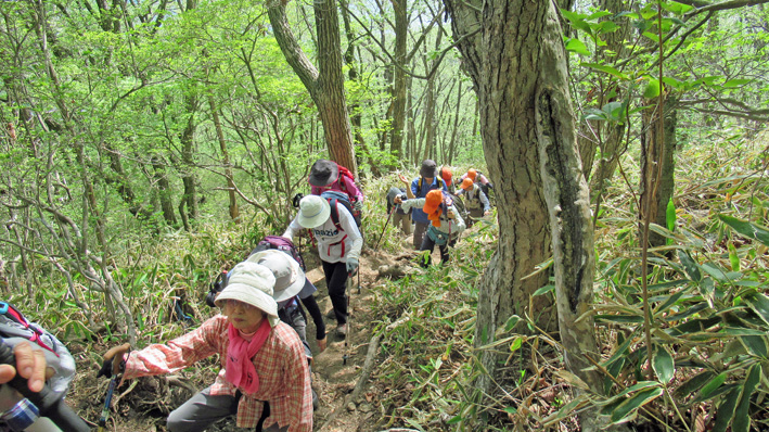 昼食後、東氏の100回参加表彰を行い30分後に下山。途中雨模様となり急いで慎重に降りる。