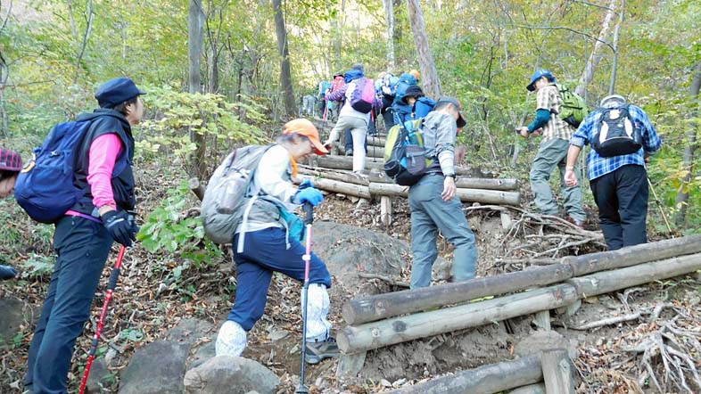 歩き始めは緩やかな道が続くが、30分も歩いた頃からは、登り下りのアップダウンの繰り返し。蹴上の高い木製階段、幅の狭い鉄製の急階段など、結構ハードな道が続く。