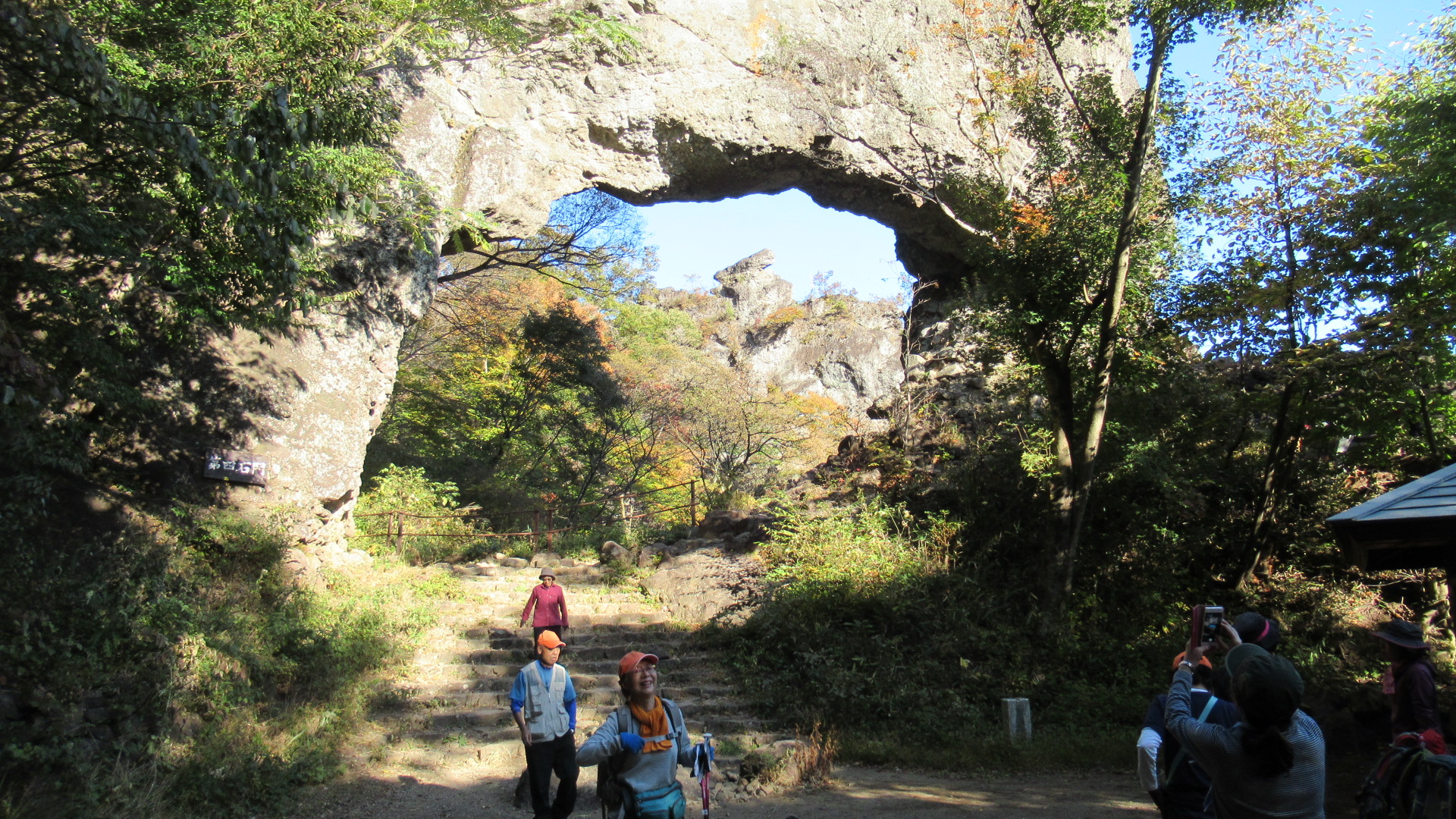 奇岩大砲岩バックに記念写真を撮り、バスの待つ中之岳駐車場に向かう。