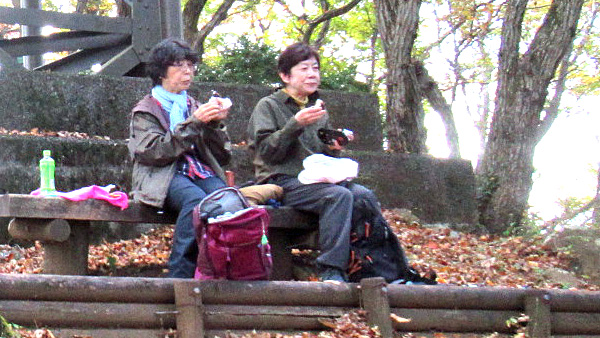 頂上には愛犬と登ってきたハイカーがいたが、比較的空いていたので、各々密を避けながら楽しみの昼食を採った。そこには10mの展望台があり少人数に分けてそこに登り、宮ケ瀬湖や紅葉が始まった遠くの山々の360度の眺望を楽しみ、ハイキングの醍醐味を堪能した。