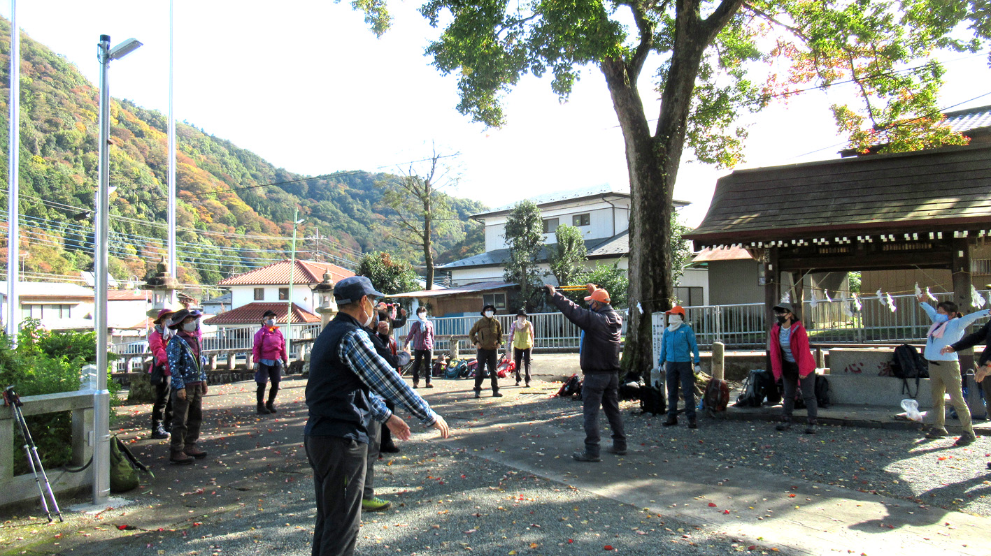 当日の本厚木駅集合時間は8時半だったが、バスの混雑を避けるため、早めに集合した参加者は先発隊として8時20分のバスで出発。撚糸組合前バス停で下車し、バス停そばの半原神社で登山の安全祈願をして待機した。