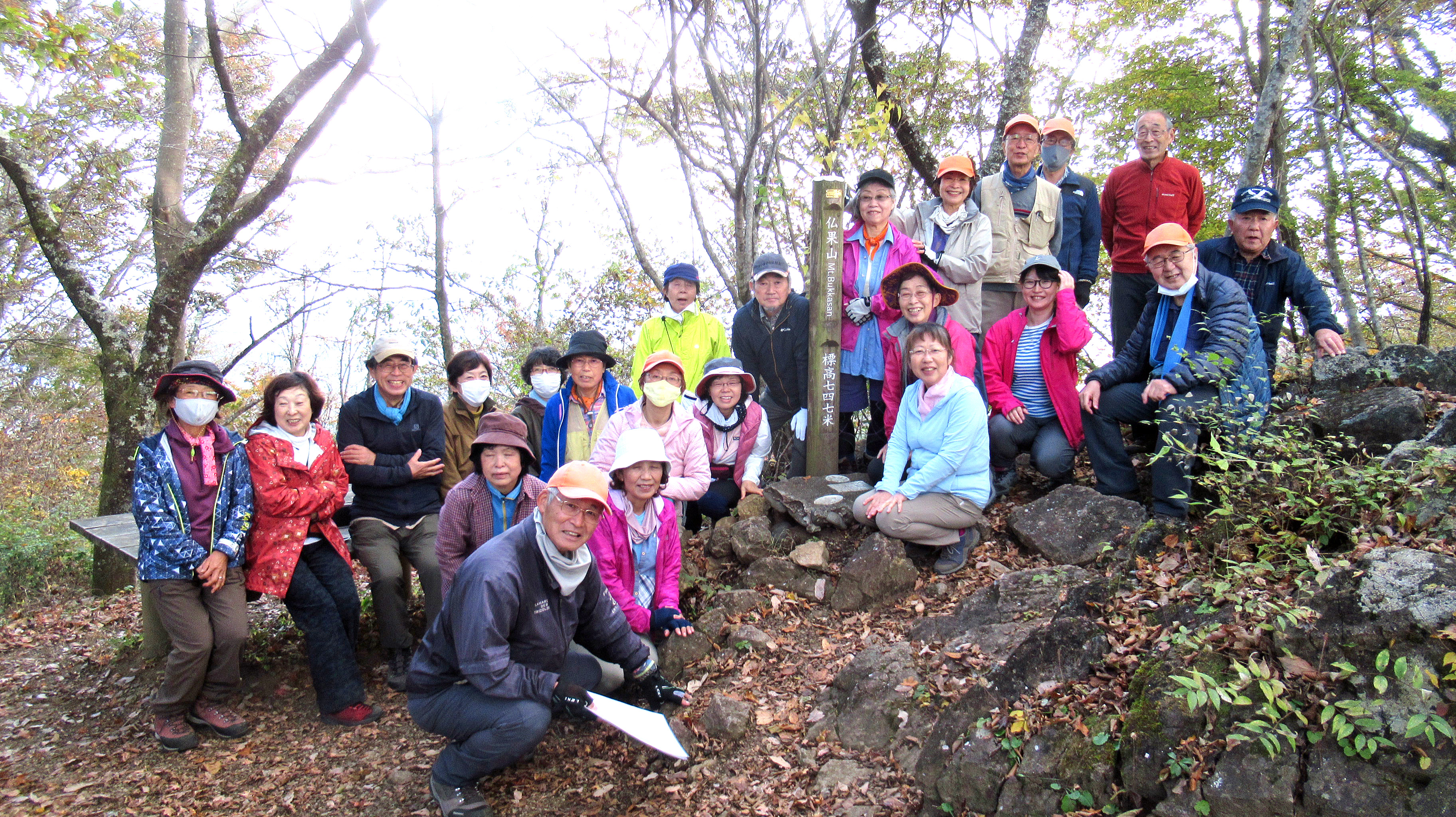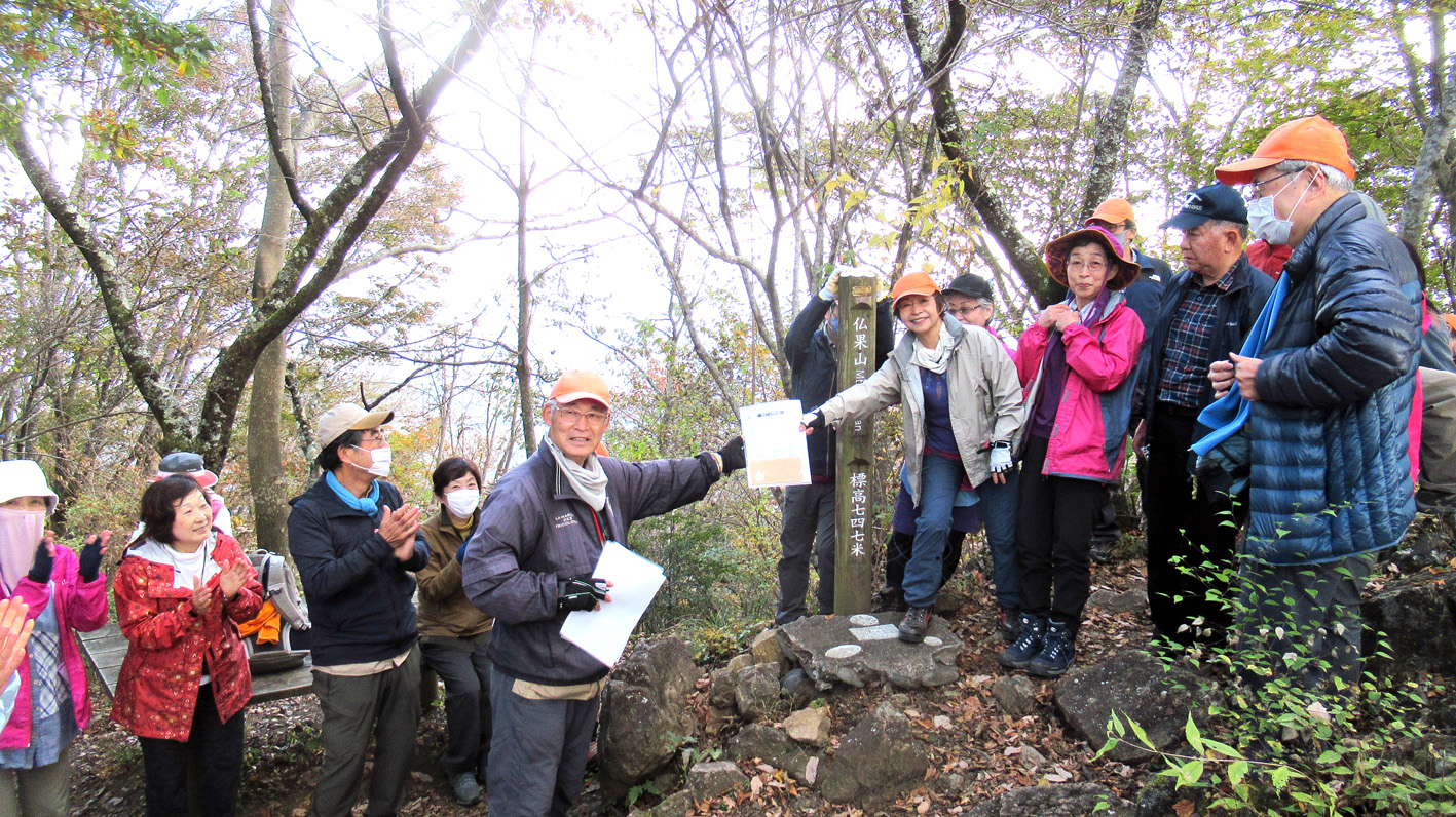 11月9日(月)総勢24名(うち女性15名)で、丹沢山地の東部に位置する仏果山ハイキングを晴天のもと楽しんできた。