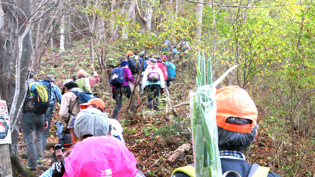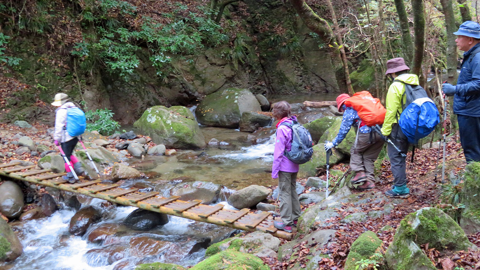 反面渓流沿いは、歩いていても水の音などで爽快感がある。道は所々で渓流を横断するため数か所に木製の橋がかけられていた。危険な橋渡りもあるため、改めてバランス感覚が試された機会でもあった。