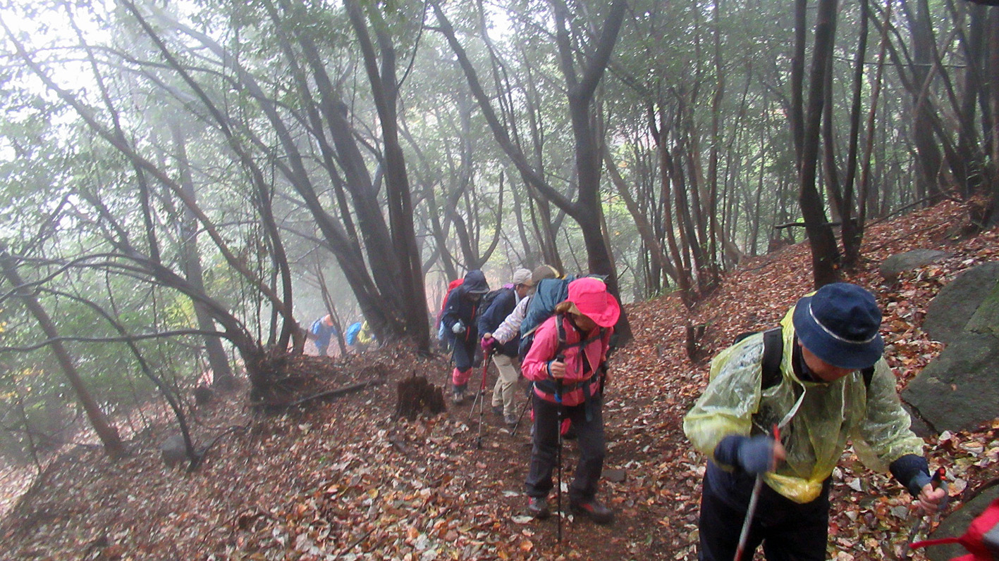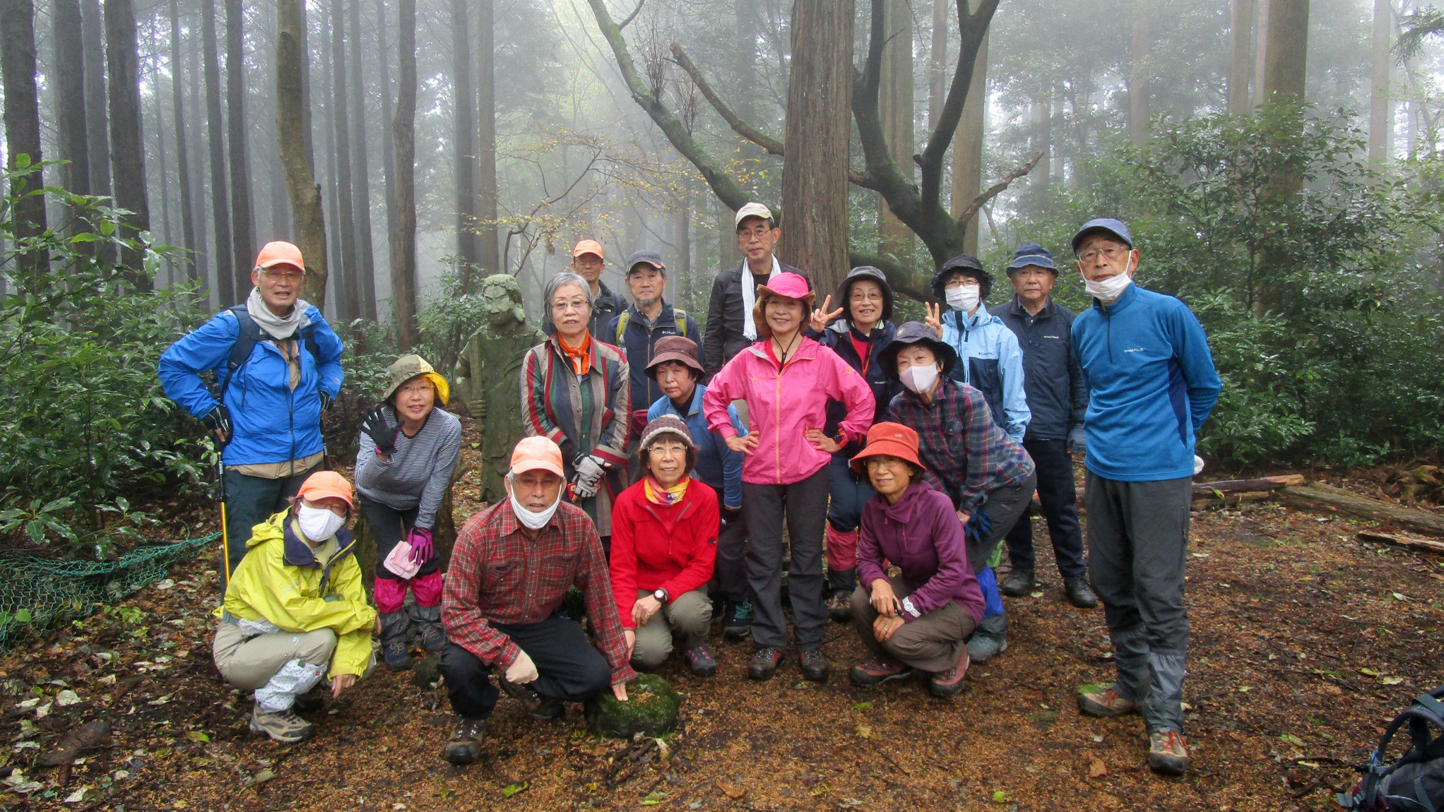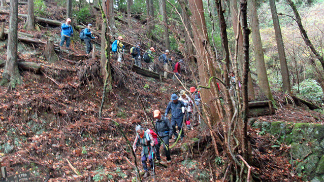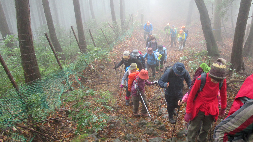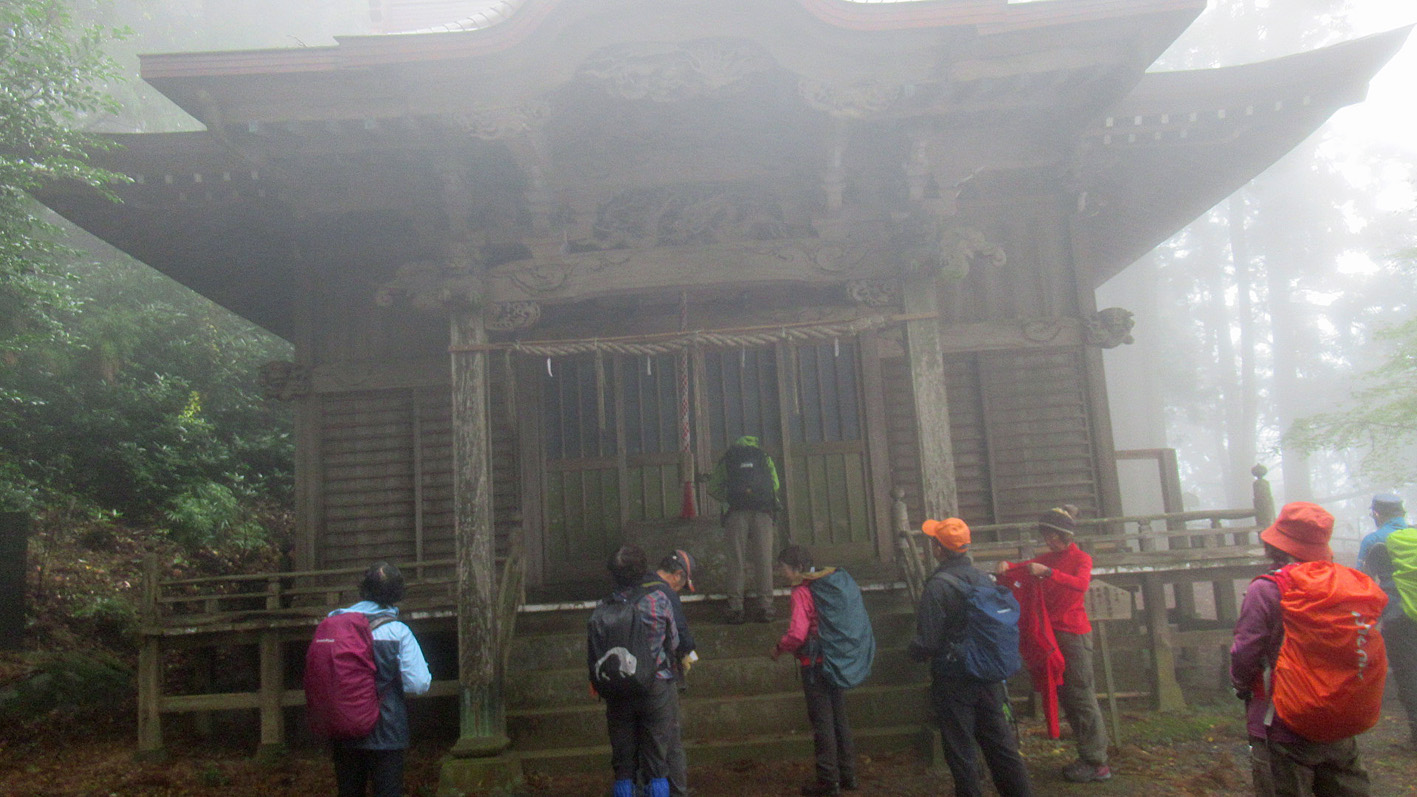 標高差460m、登山道は比較的緩やかな登りから始まり、だんだんく険しくなっていく。最後に370段の長い階段を登り切り山頂直下にある浅間神社に到着。時間は11時20分。この神社は室町時代前からで古く、富士山浅間信仰の神社でもある。出発から約2時間で山頂に到着。雨も上がっていた。山頂でお昼の弁当を楽しみ、40分ばかり休んだ後下山。一時間ばかり緩やかな坂を下って行くと、不動尻と広沢寺温泉の分岐点に出た。少し歩いて不動尻渓流、谷太郎川に降りていく。