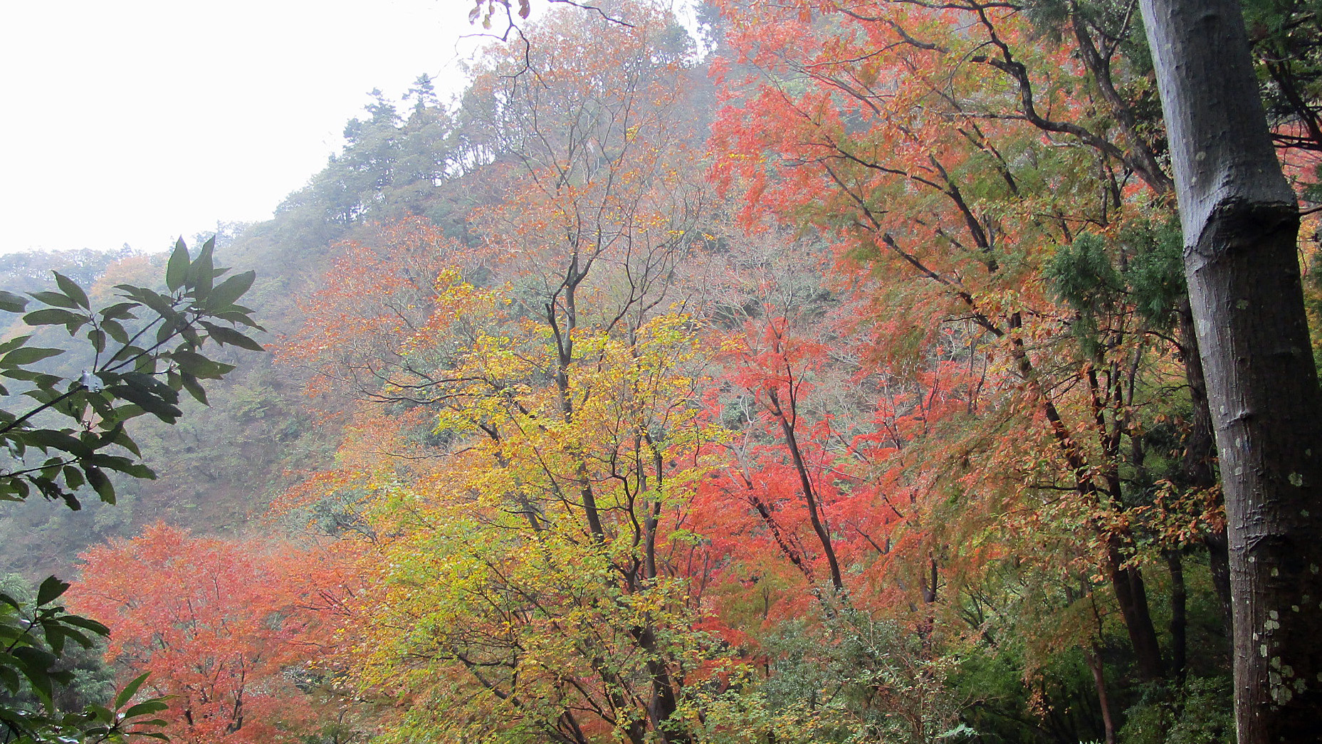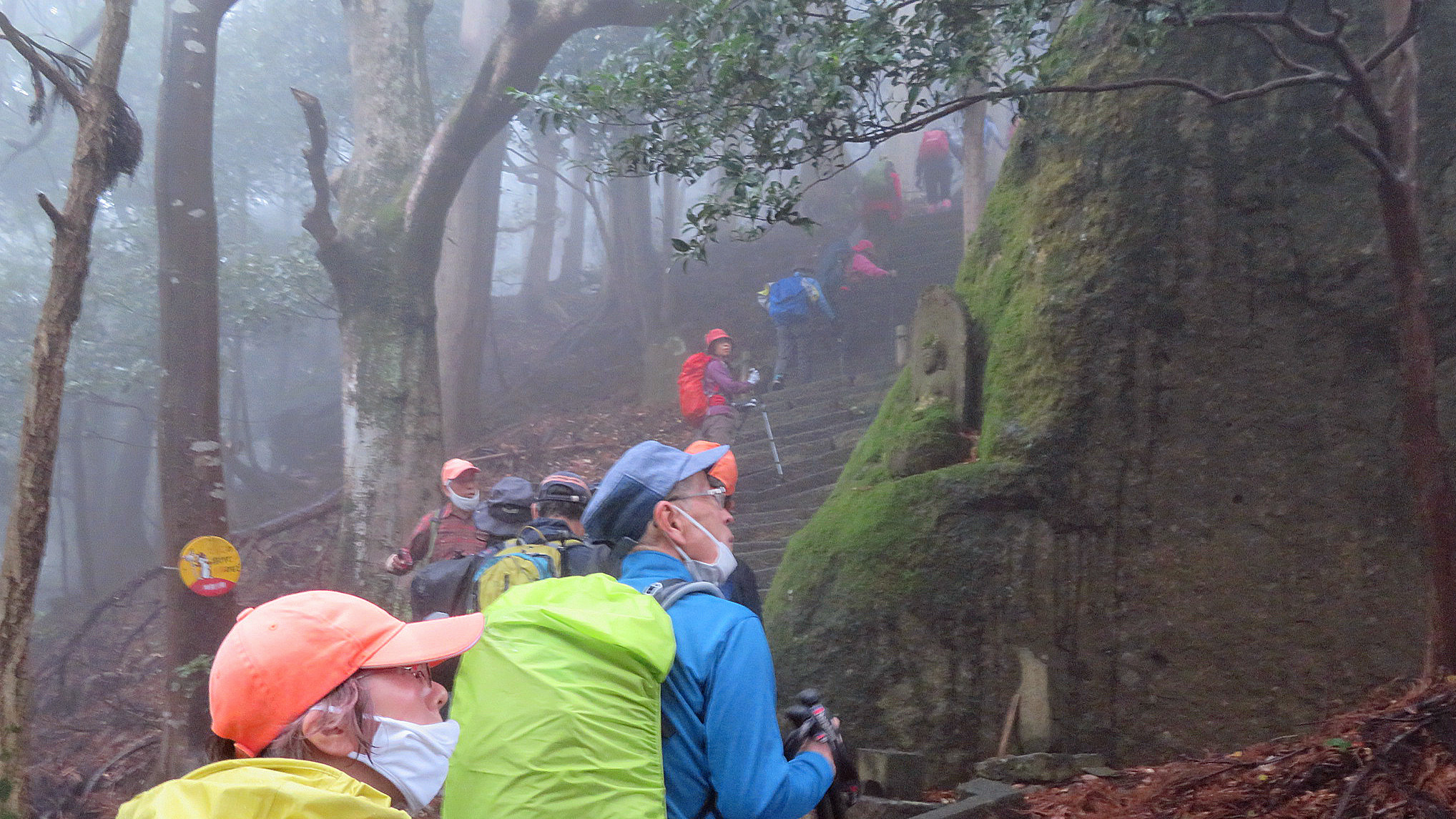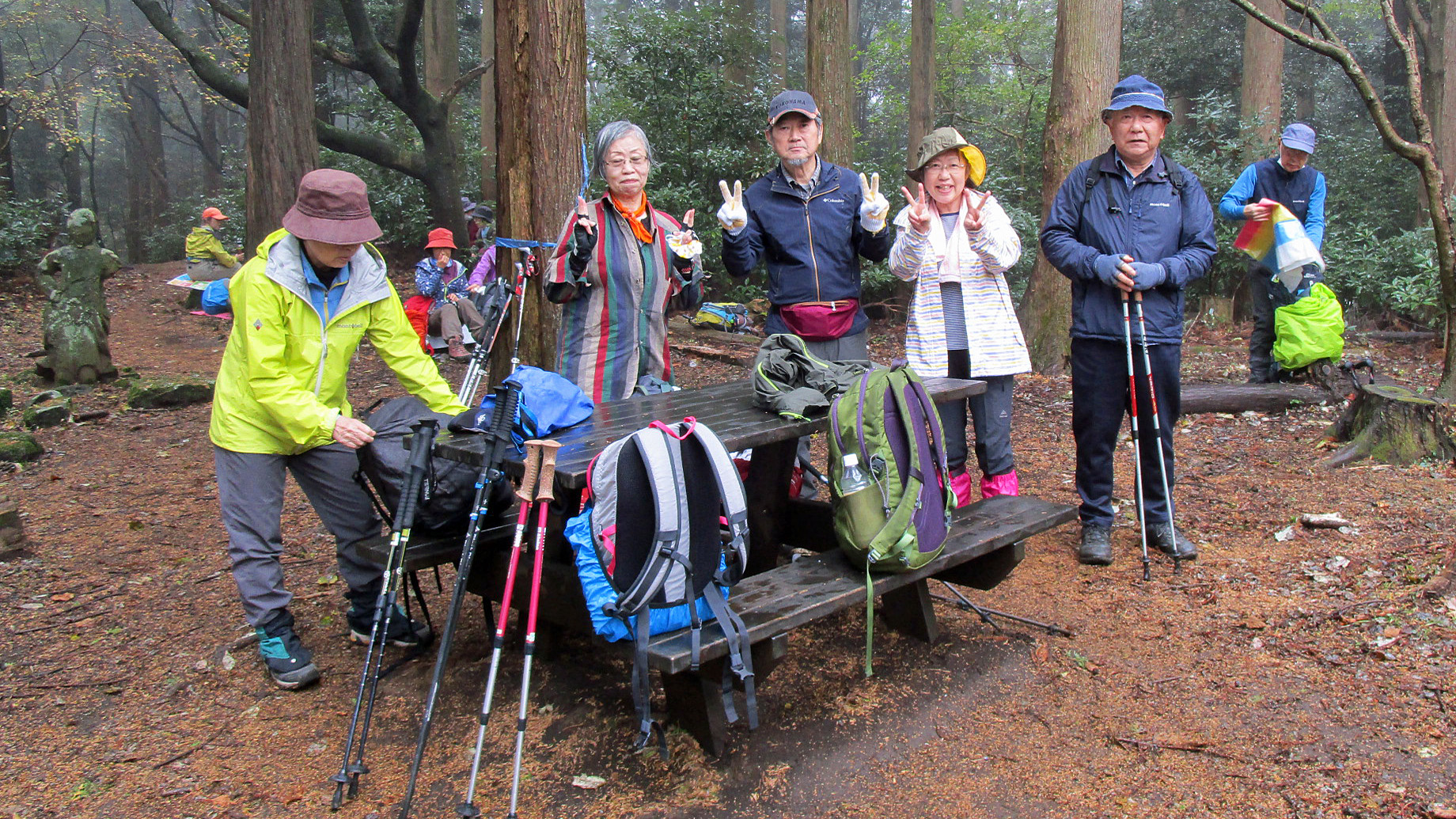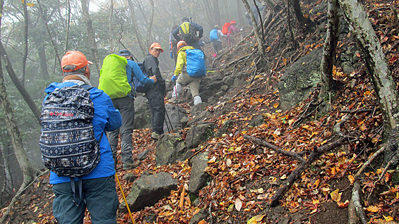 標高差460m、登山道は比較的緩やかな登りから始まり、だんだんく険しくなっていく。最後に370段の長い階段を登り切り山頂直下にある浅間神社に到着。時間は11時20分。この神社は室町時代前からで古く、富士山浅間信仰の神社でもある。出発から約2時間で山頂に到着。雨も上がっていた。山頂でお昼の弁当を楽しみ、40分ばかり休んだ後下山。一時間ばかり緩やかな坂を下って行くと、不動尻と広沢寺温泉の分岐点に出た。少し歩いて不動尻渓流、谷太郎川に降りていく。
