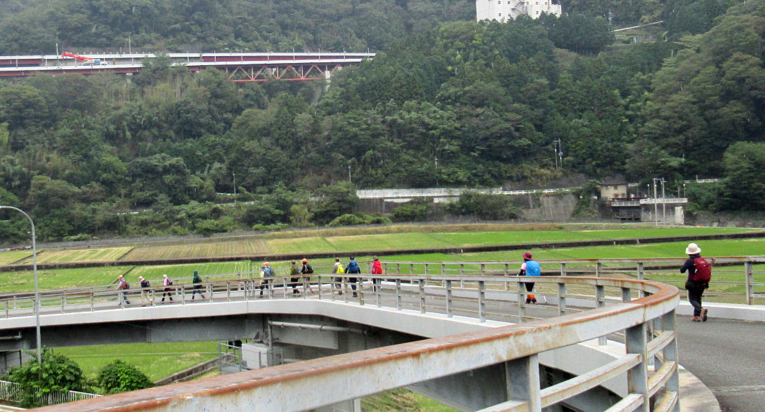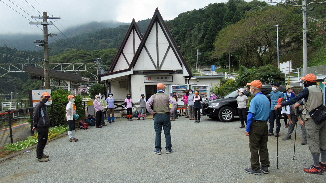 当日の天気予報は曇りで夕方から小雨ということであり、快適なハイキングを満喫できると思いきや、朝から霧雨で且つ小田急線の人身事故で多くの参加者がその影響を受けた。 本来集合場所の谷峨駅に10時(列車は9時38分着)からほぼ30分遅れの10時30分に 新松田からタクシーで集合場所に来られた人もいて参加者が全員揃った。