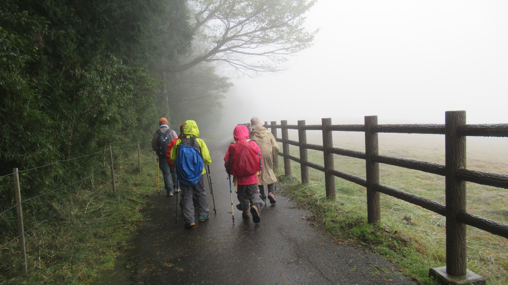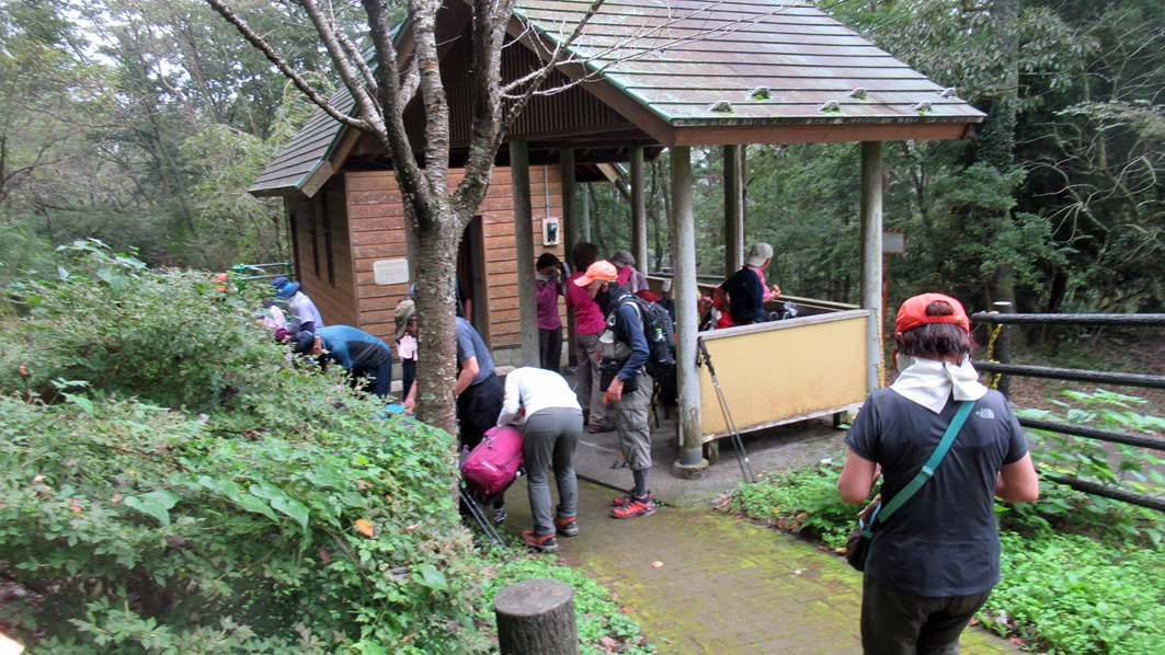 頂上を目指す20名は小雨をもろともせずに、鹿よけゲートを貫けて落葉を踏みしめ、ススキの群生や周りの綺麗な花々を見ながら歩を進めた。そして、最後の休憩所には他の若いパーティーが食事をしていたが、そこで少し休憩をとって頂上へ向かった。