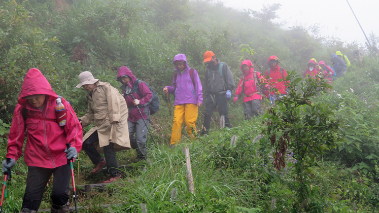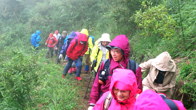 スタート直後は一般道だが、登山道に入る前に水分補給と服装調整を行った。霧がかかった状態で視界は良くなく、いつもより蒸し暑い。25名という隊列のため先頭から最後尾まで長くなったが、最後尾には幹事の川島さんを配置していたので安心感のある体制で、他のパーティーとのすり違いもなく我々のペースで歩くことができた。
