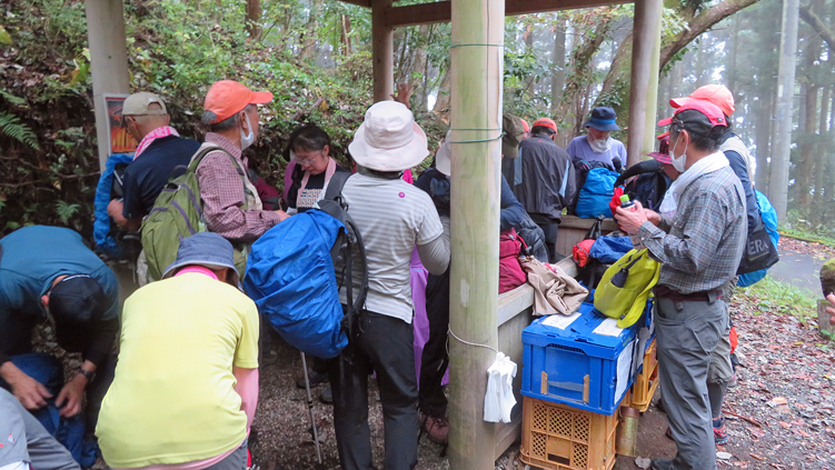 この休憩場所に到着した12時時点でも小雨が降りしきり、ここで安全確保のため頂上を目指さなく谷峨駅に引き返す希望者を募った。こういうこともこれまでのハイキングにはないことで、熟年層の多い会員の安全確保を重視した選択であった。