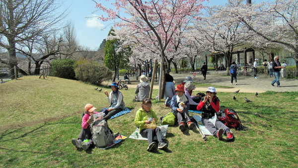 公園には正午過ぎ到着、満開のサクラを眺めながらの昼食は正に至福の時!
