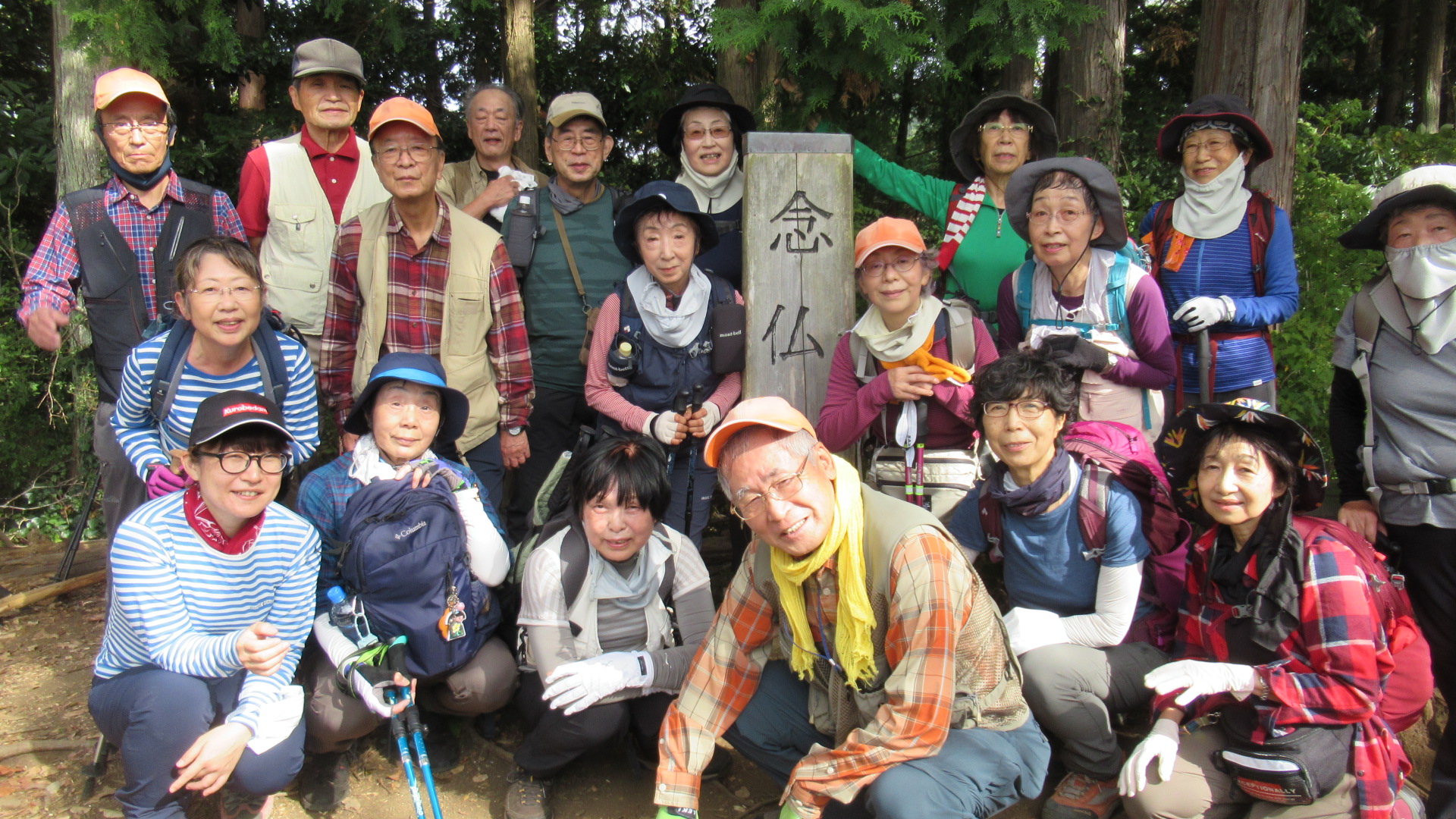10時30分切通しとなっている善波峠に出る。矢倉沢往還の径で石仏が佇んでいて当時が偲ばれる。尾根道を登って10時50分、標高357mの念仏山に到着。山頂は狭いが、本日のコースでは一番のビューポイント。秦野市街地な箱根の山が見える。残念ながら富士山は見えず。脇には石仏が祀られている。