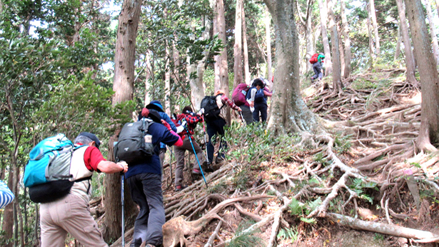 念仏山を少し下って尾根道を緩やかに登り、走り根の急坂をふたつ越えて12時10分に標高556mの高取山に到着。