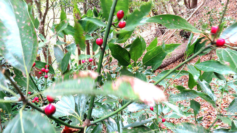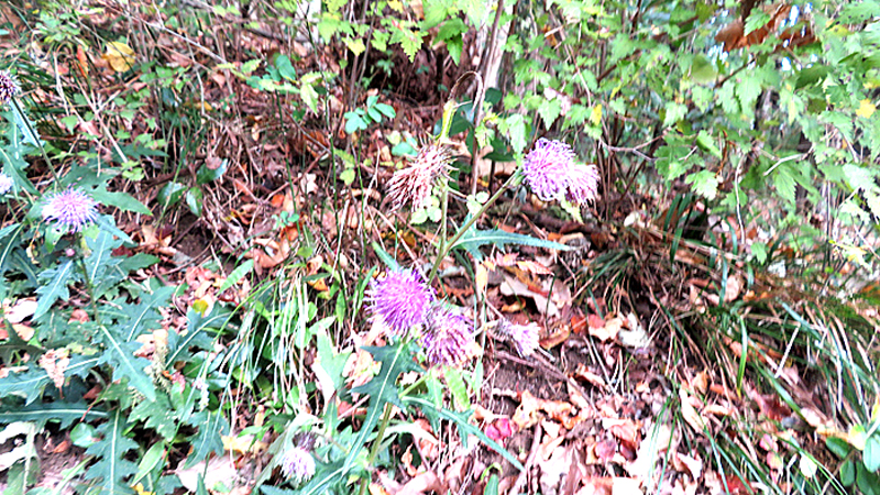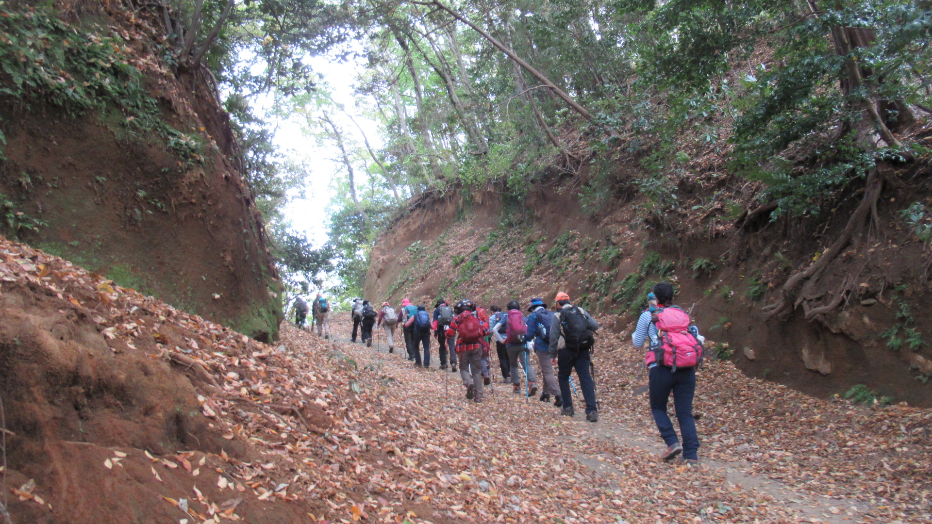 ここで昼食。強風の為、木の葉が雨のように降り、弁当箱の中にも。12時40分に下山開始。急坂を降りると小蓑毛分岐に小鞍部に出る。左折してゴルフ場脇の道を下り、車道に出て集落を抜け、田原ふるさと公園に到着。