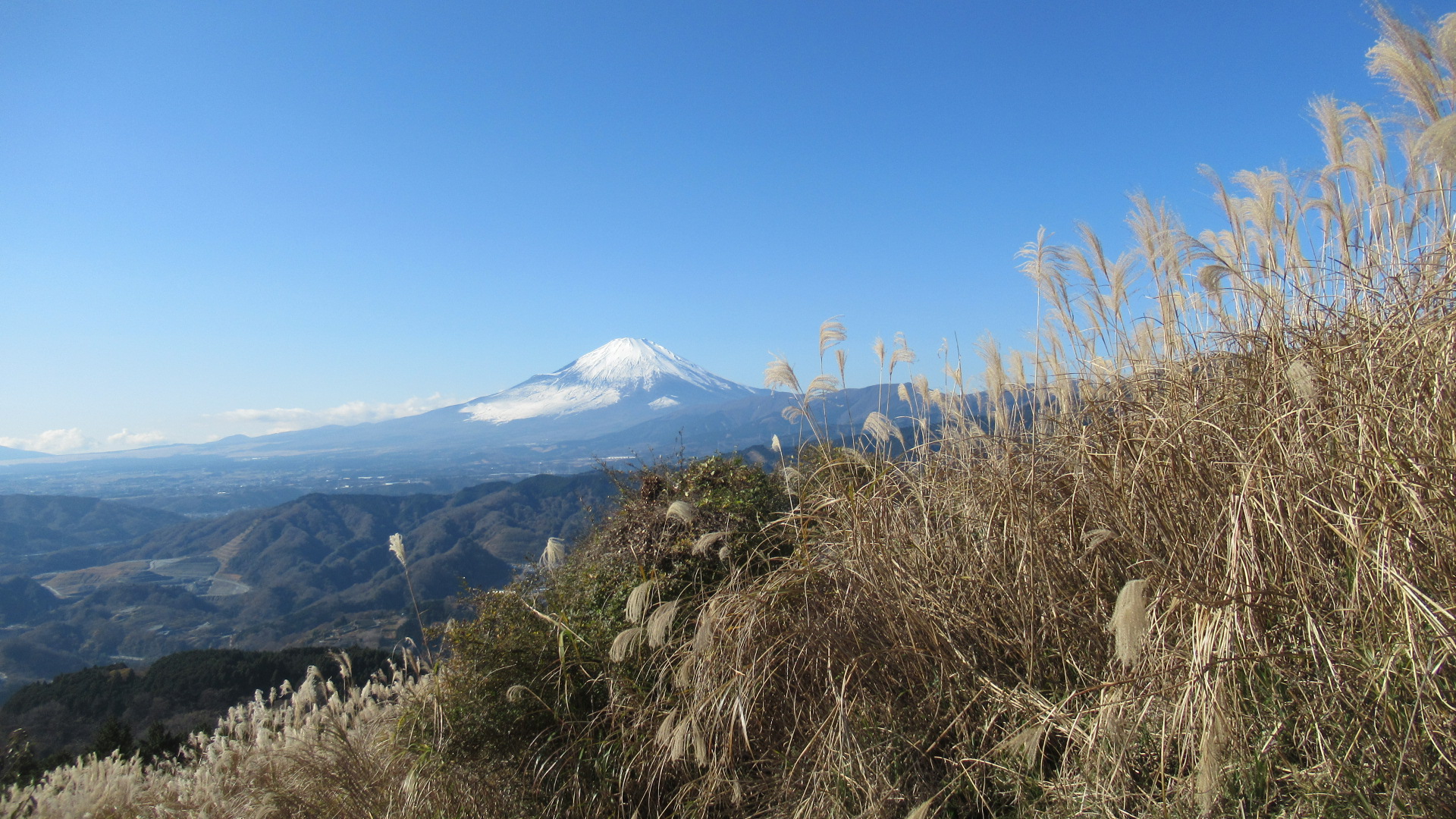 梅干し・味噌等の無人販売がある。5分ほど休憩して尾根道を登るとすぐに展望が広がり、左側に富士山・相模湾が見えてくる。12時10分標高723mの山頂に到着。