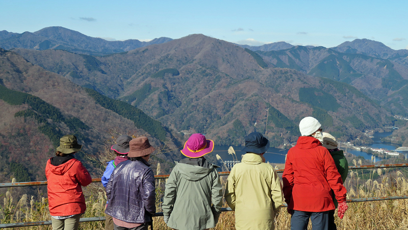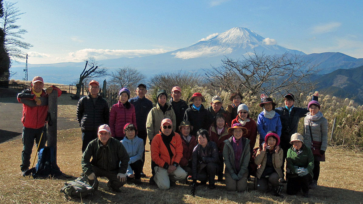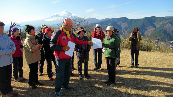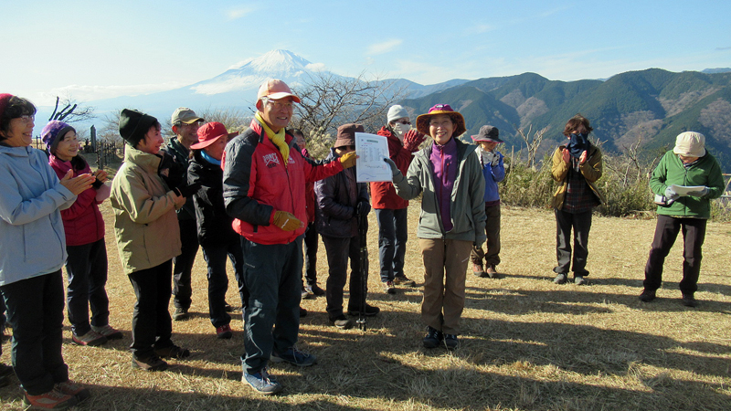 山頂は平坦であずまや・トイレがあり、牧歌的な雰囲気が漂い、雲一つない富士山・西丹沢の山々、青々とした丹沢湖を見下ろせる。皆さん、絶景の風景を見ながら昼食をとる。団体写真撮影、25回・50回参加者表彰を行い12時50分下山開始。