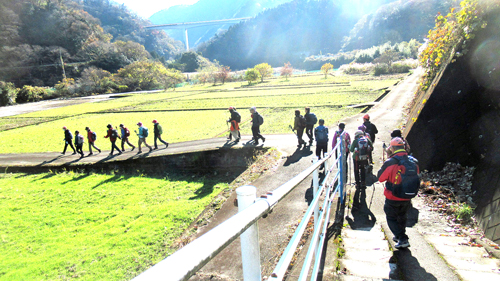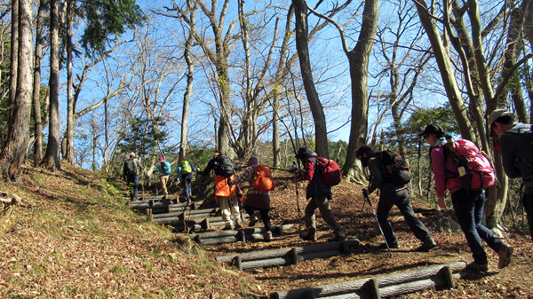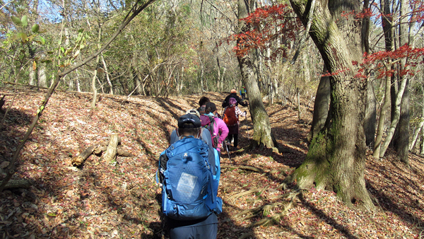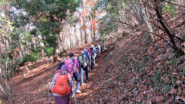 御殿場線と246号線の陸橋と吊り橋を渡り、嵐集落に。ここから登山道が始まる。途中、木漏れ日の中、真紅の紅葉と緑の木々との素晴らしいコントラストに歓声が。