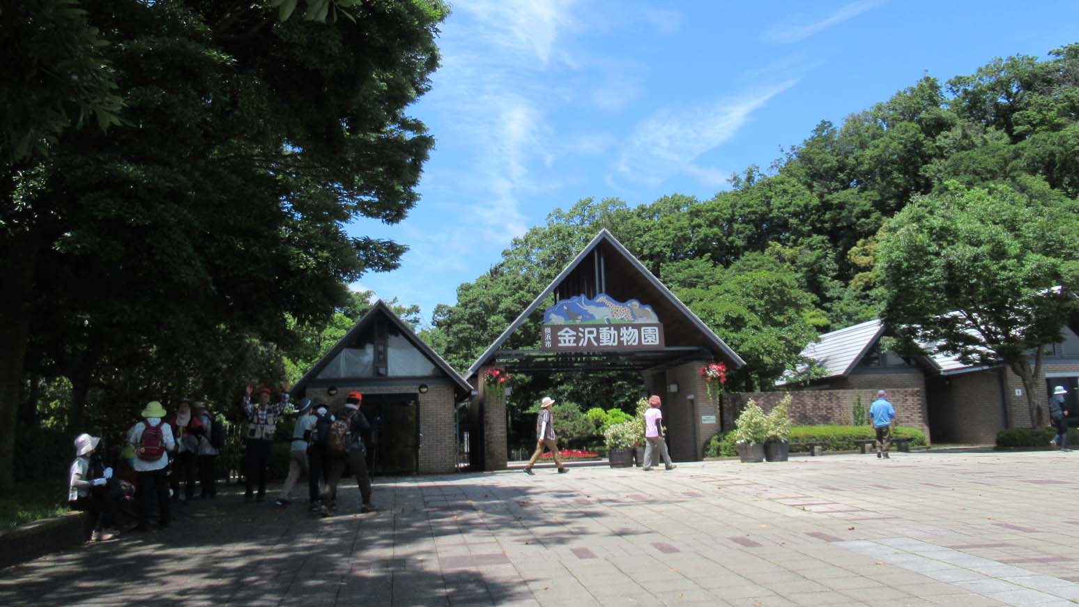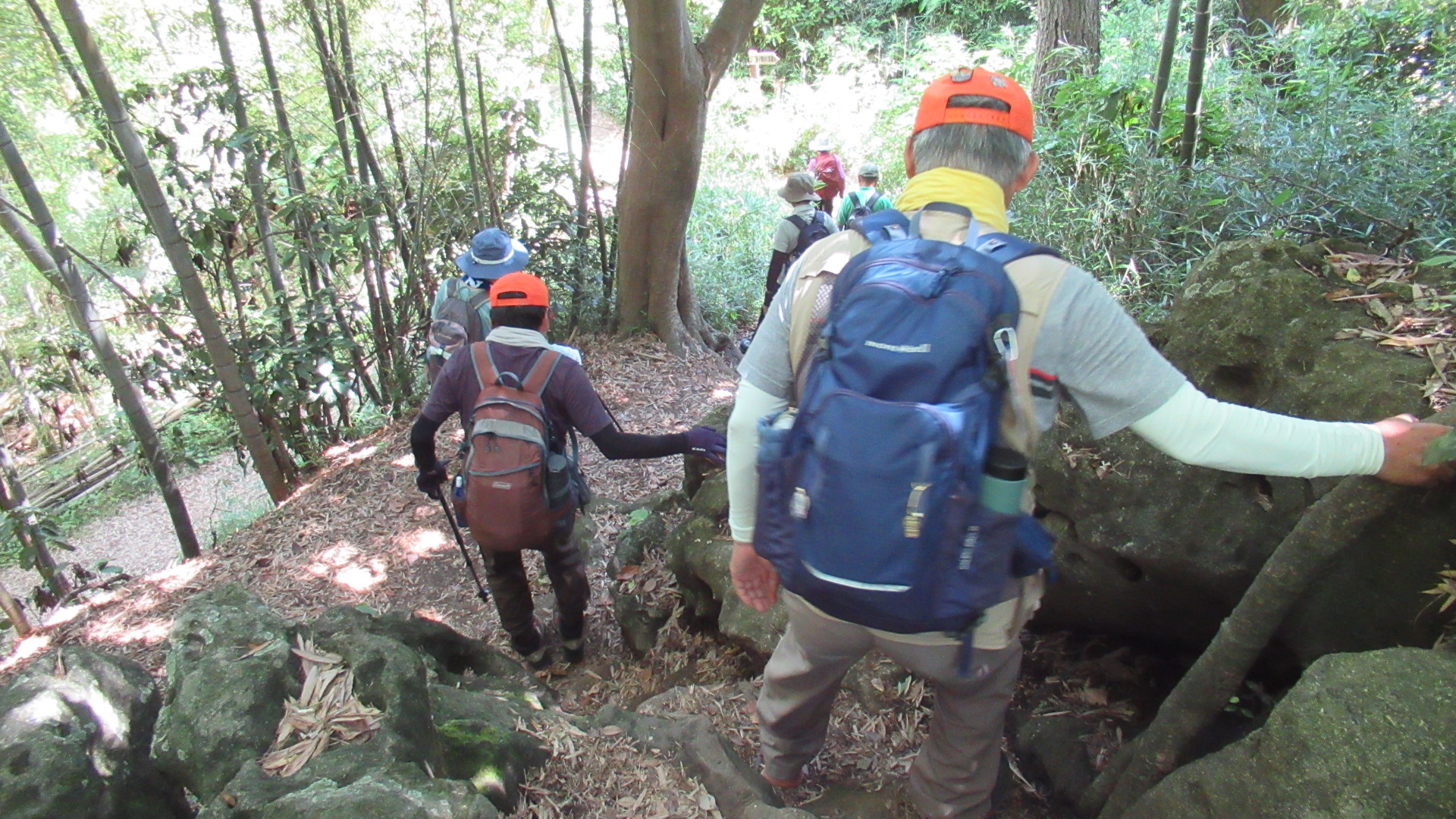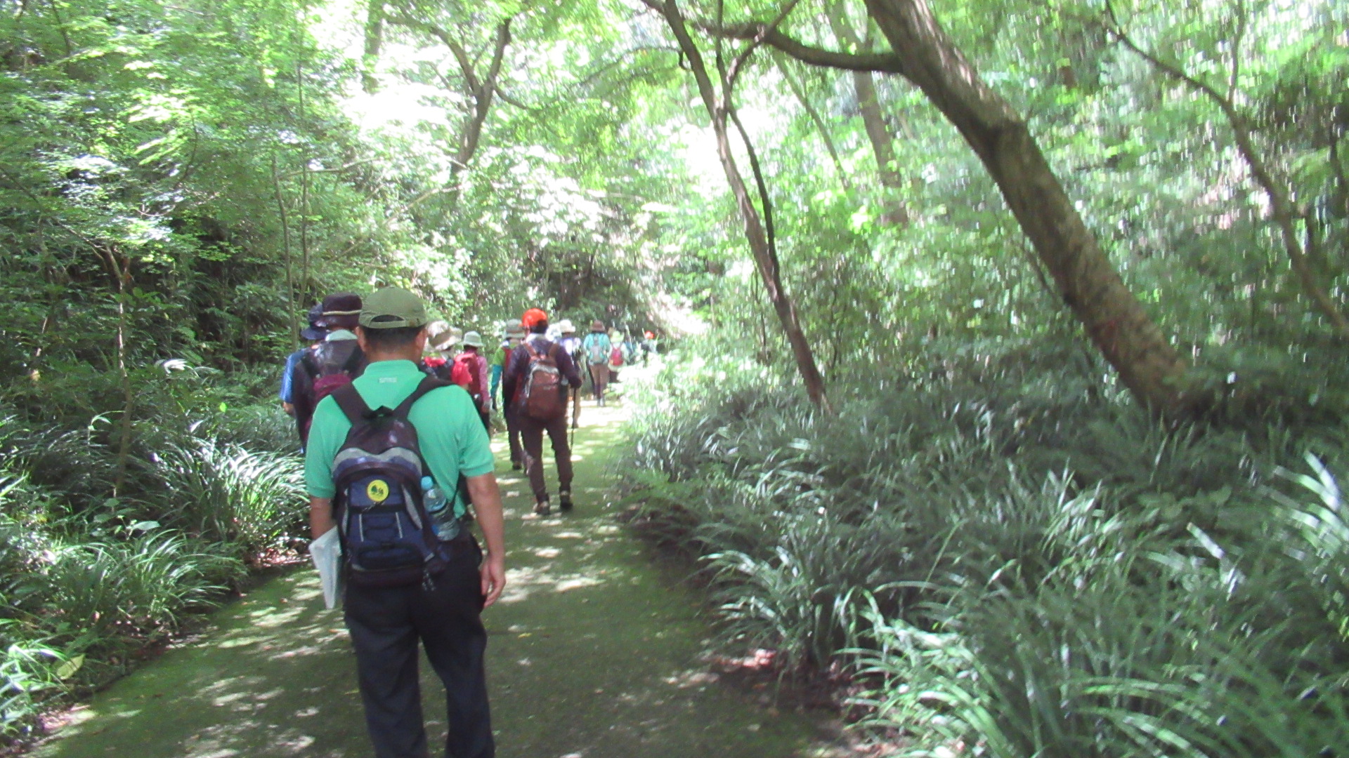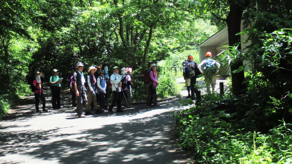 小休止の後、林の続く登り道を少し行くと林の中にポツンとある谷津関ケ谷不動尊近くを通り、木々に覆われ涼しい風も吹き抜ける歩き易い道をしばらく歩くと金沢動物園入口前に到着しました。ここで小休止、熱中症予防のための水分補給を十分行い動物園脇の山道を登りシダの谷に向かいました。