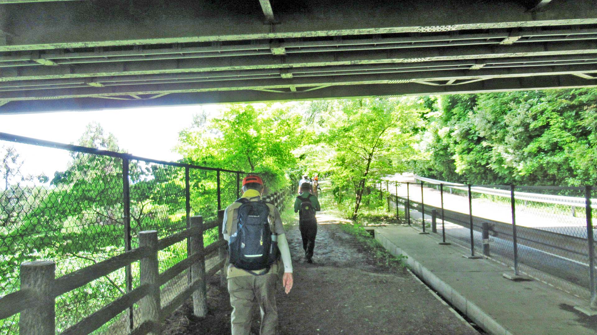 工事中の高速道路の脇をしばらく進んでひょうたん池経由大丸山に行く道と分岐点に着きました。ひょうたん池経由大丸山への道はひょうたん池から大丸山への登り階段が長く厳しいため避けてなだらかな坂道が続く道を進みました。
