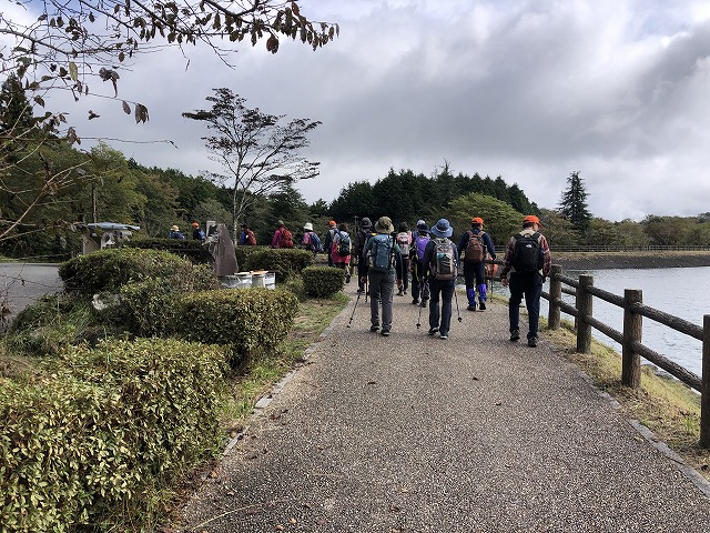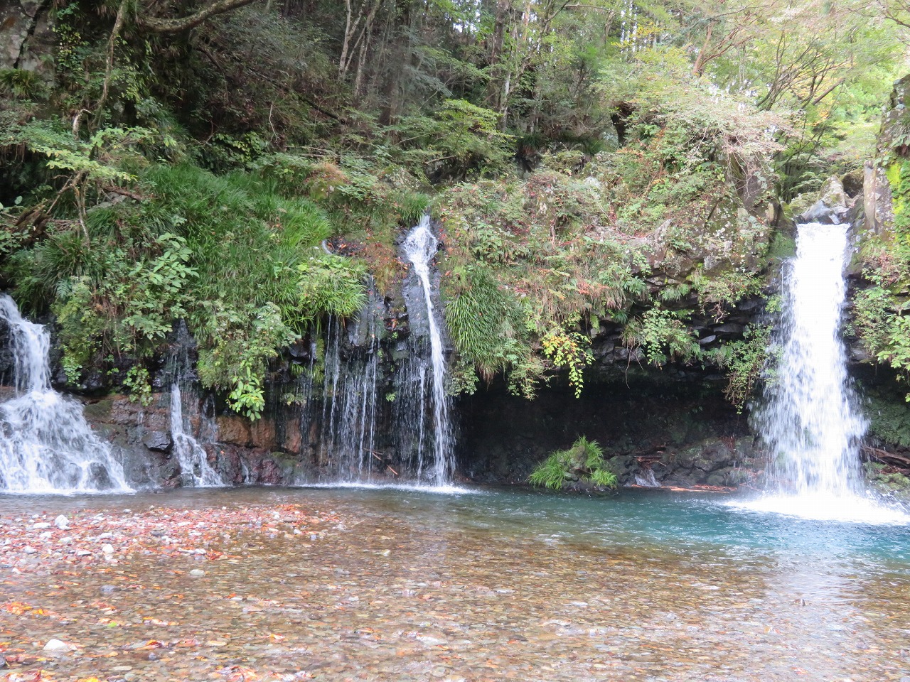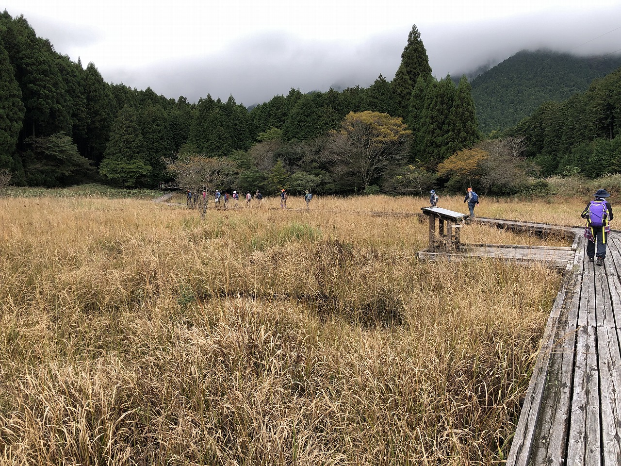 ダイアモンド冨士ビューポイントにて集合写真・ストレッチを行って11時にハイキングスタート。釣り糸を垂れている釣り人を横目に湖畔を歩く。すがすがしいハイキング日和となる。雲の変化が激しく一瞬で富士山の姿が消えてしまう。富士西麓では唯一残された湿原の「小田貫湿原」を経由して12時10分に「陣場の滝」に到着。