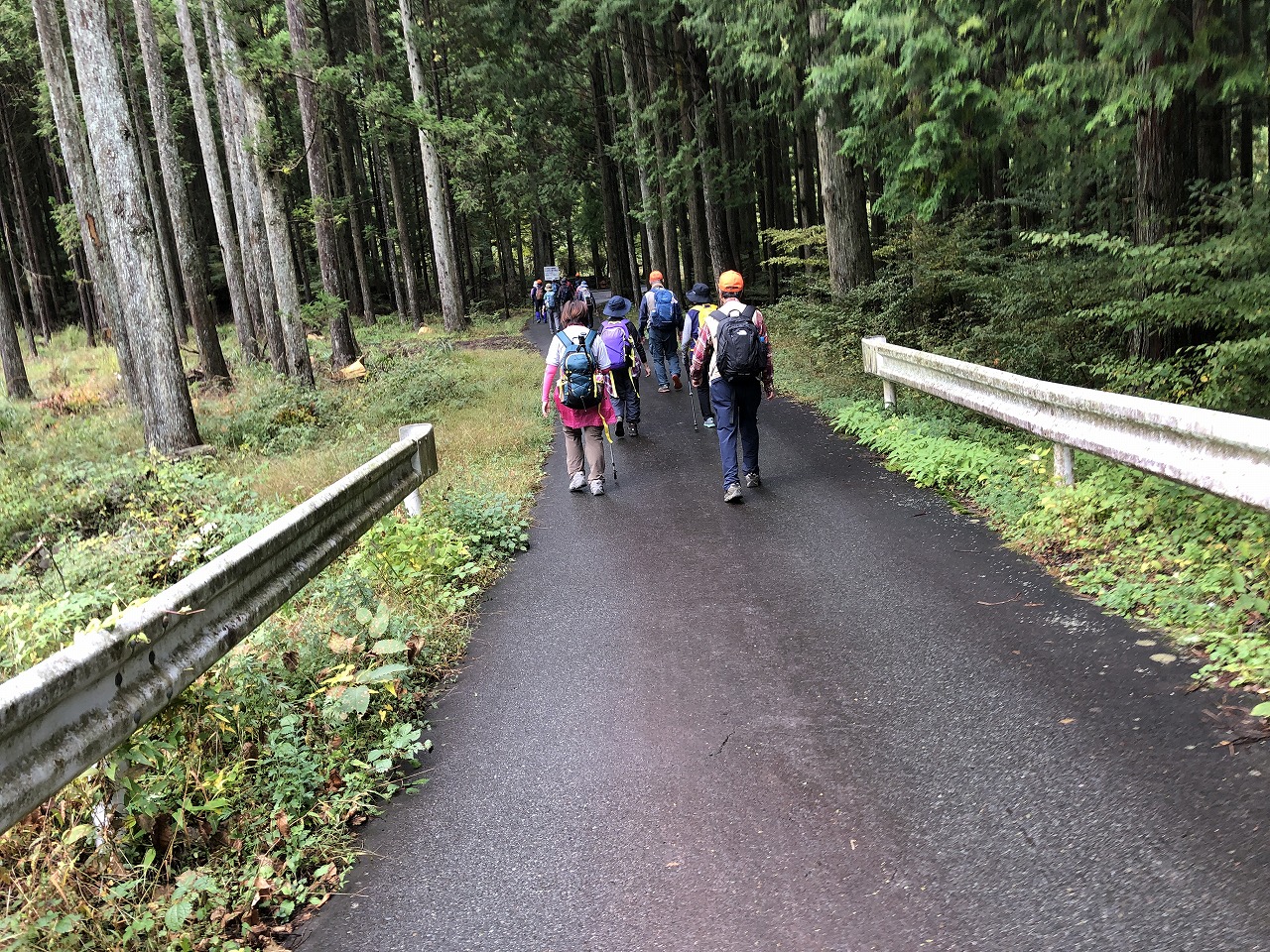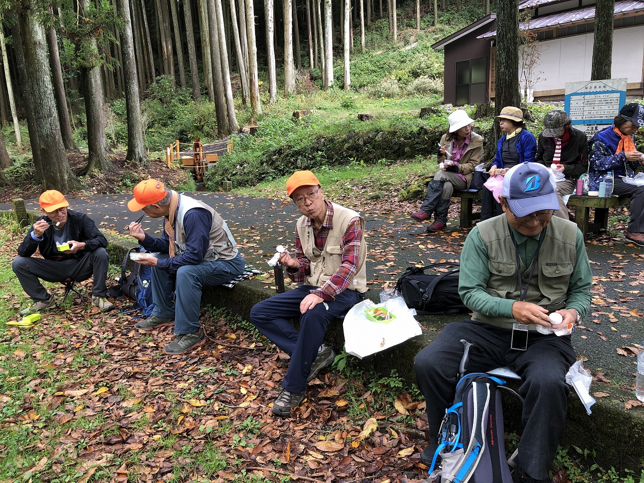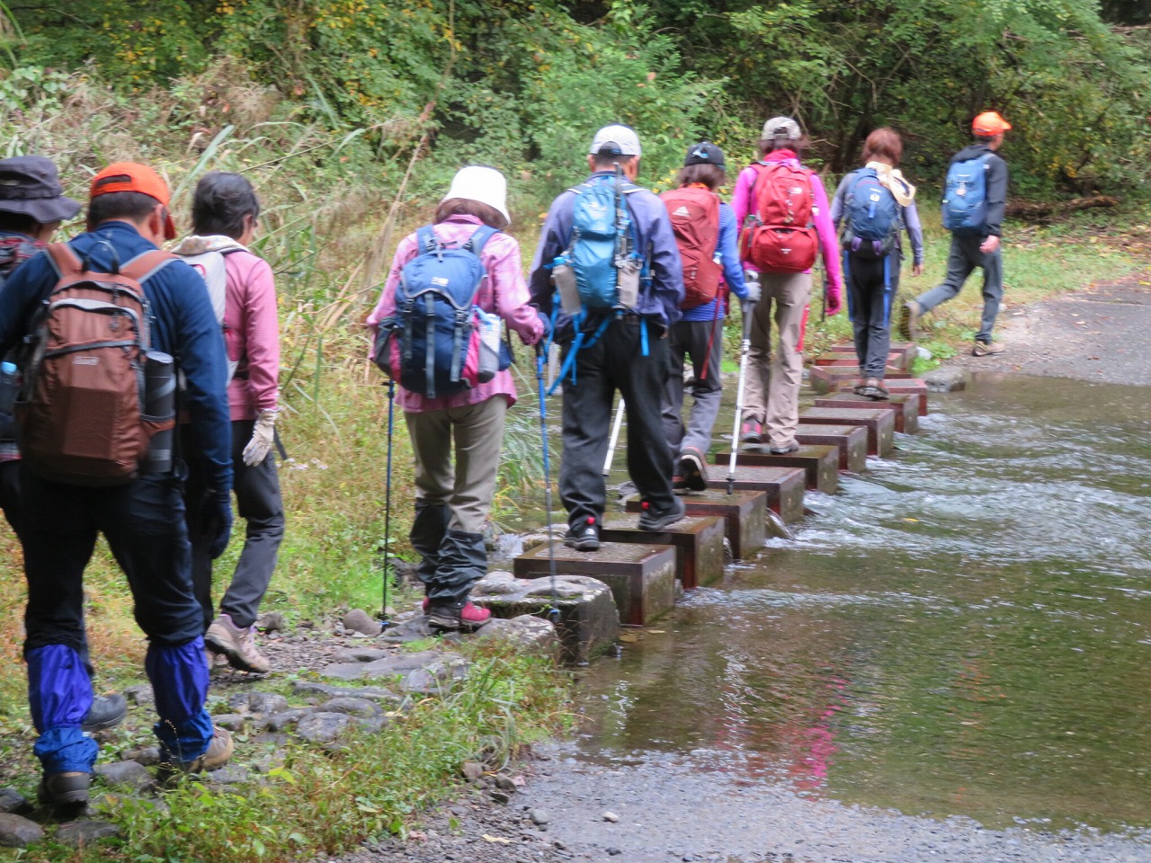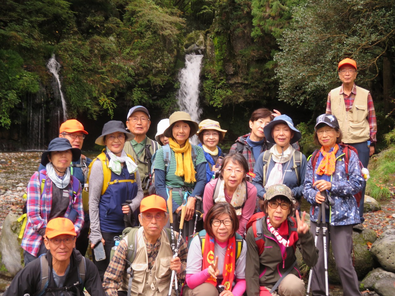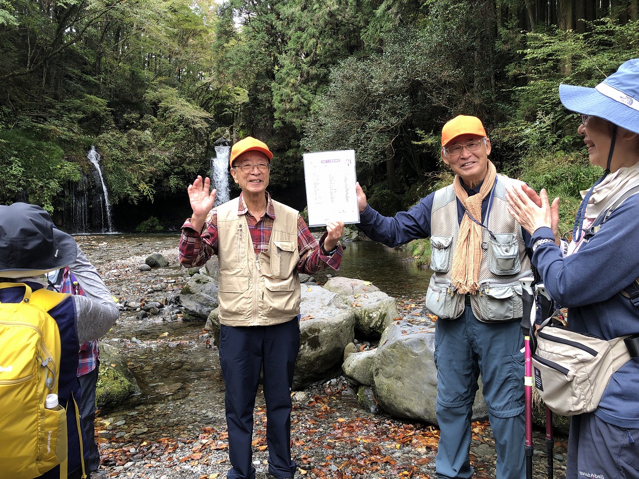 昨日からの雨で滝の水量も多い。昼食・トイレ・集合写真撮影後、内田幹事75回参加の表彰式を行い、12時50分にスタート。東海自然歩道を歩く。所々、キャンプ場にテントが張られている。雲に隠れて全く富士山は見えず。麓のつり橋に到着。