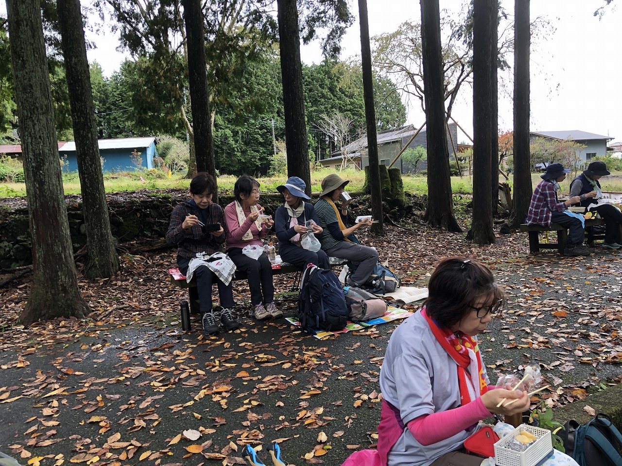 前日から雨。当日、集合時間でもまだ小雨模様。マイクロバスに乗車し8時に出発。中央高速経由で「田貫湖休暇村富士」に10時40分到着。