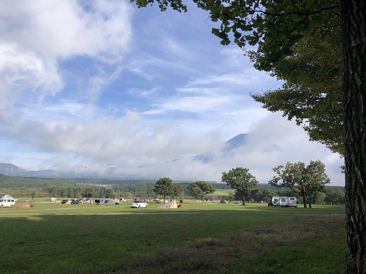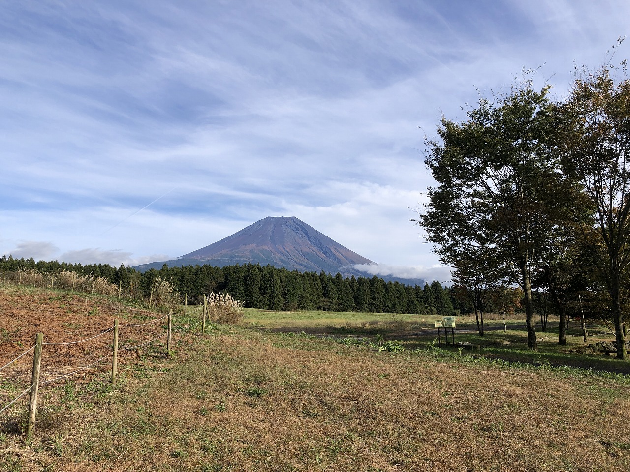 クールダウン後バスに乗車。「道の駅朝霧高原」に向かうが途中、奇跡的の雲が消え、霊峰富士山の雄大な全景が現れる。皆さん、感動して満足の様子。