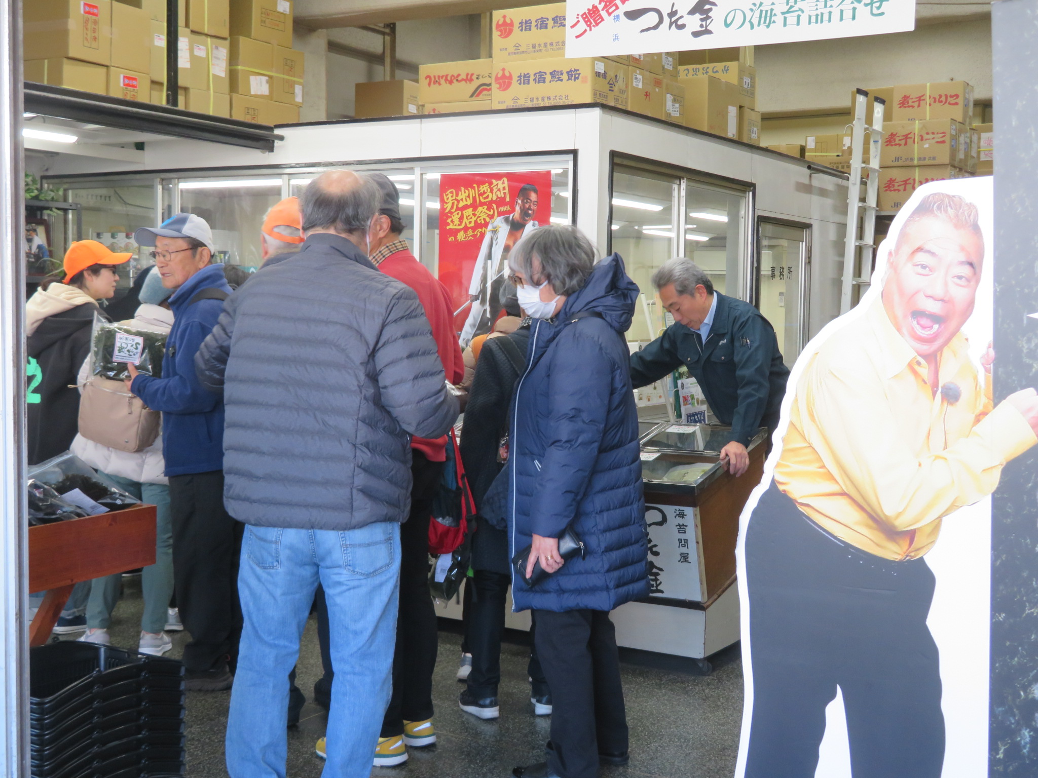ここではお兄さんの説明を受けて比較的安価な海苔や昆布などをほぼ参加者全員が買物を楽しんだが、予想外に多くの時間を要してしまった。