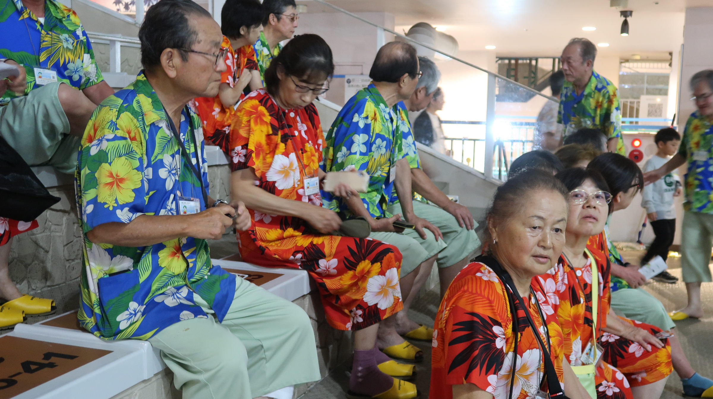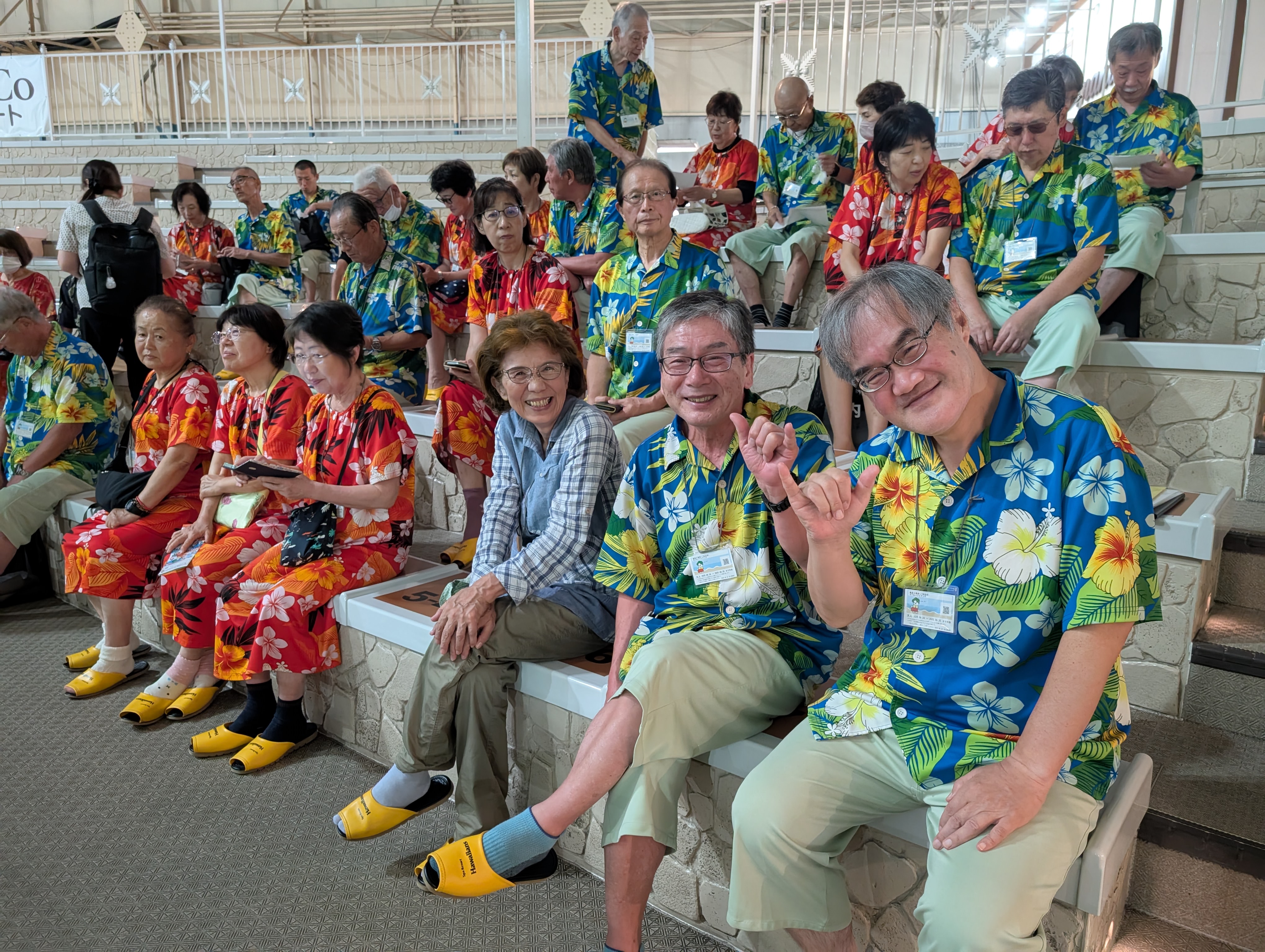 夕方からは宴会場での夕食。色鮮やかなハワイアン柄の館内着に身を包み、和やかな雰囲気の中で乾杯が交わされた(写真:宴会の様子)。