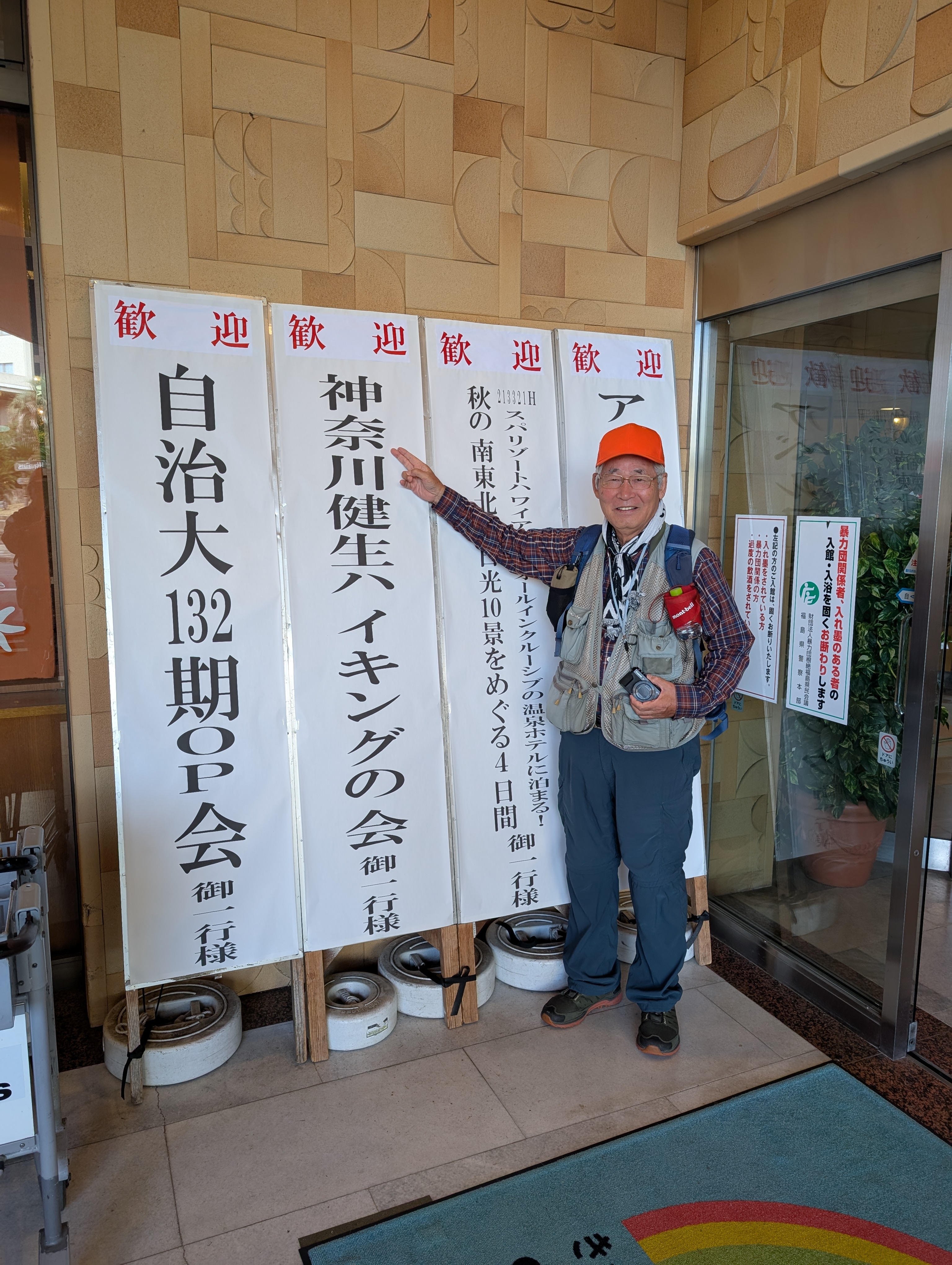 初日は横浜駅から直通バスに揺られてホテルへ。玄関には「神奈川健生ハイキングの会御一行様」と書かれた歓迎看板が掲げられ、気持ちも高まる(写真:ホテル玄関の歓迎看板)。