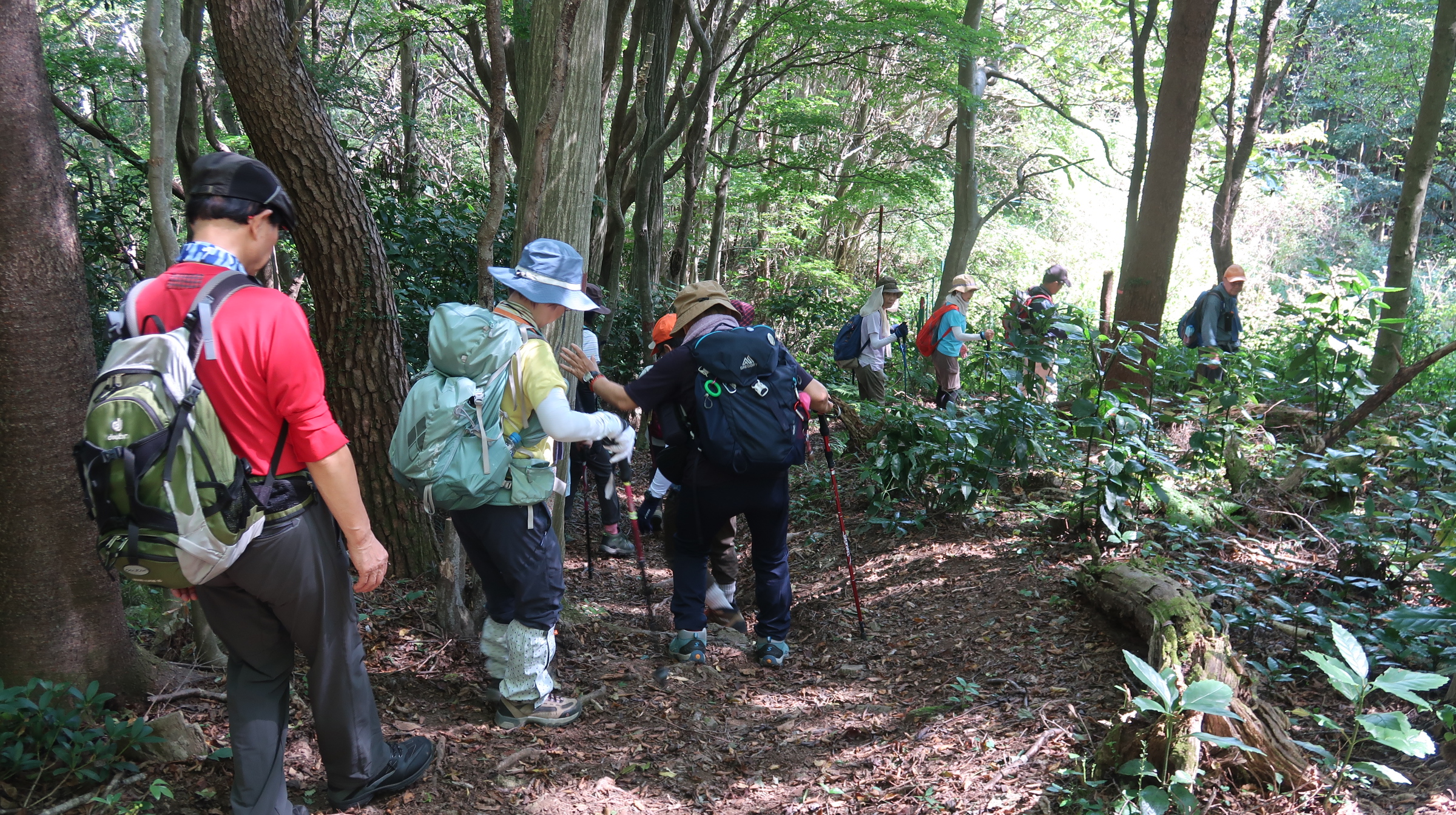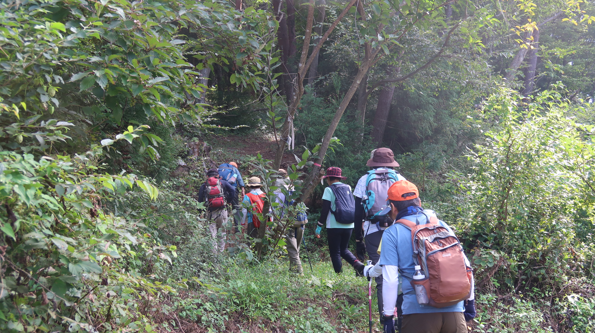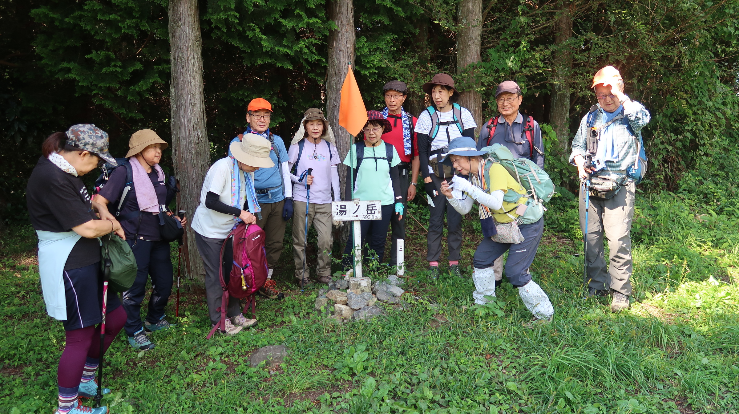 道は比較的歩きやすく、全員で無事に登頂。山頂からの眺望は限られるが、「みんなで登り切った」という達成感が大きかった(写真:山頂集合)。