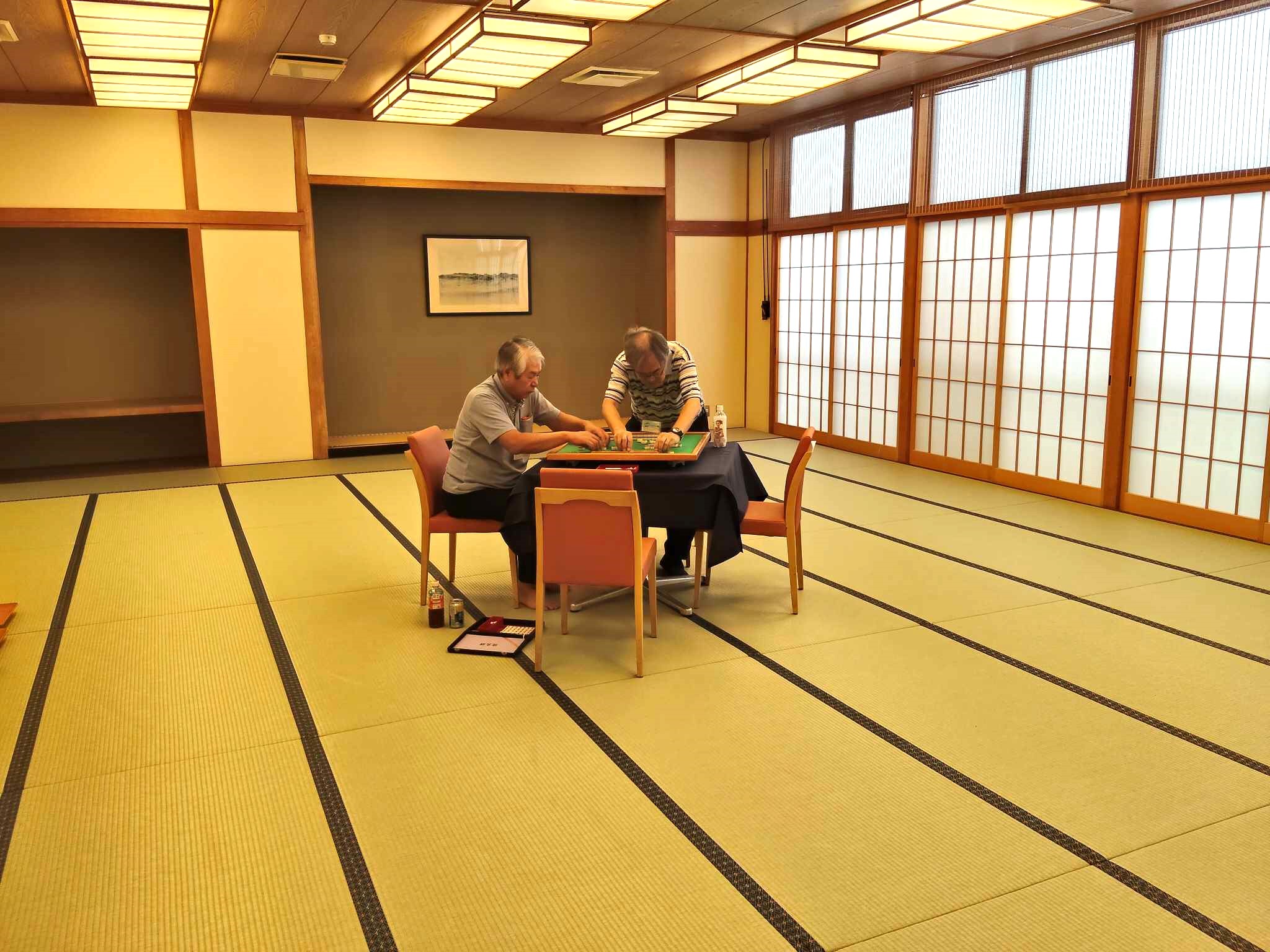 一方、麻雀組の3名は大広間に一卓を囲み、和やかに牌を並べていた(写真:麻雀組の様子)。「みなみクラブ」からのゲストでもあり、