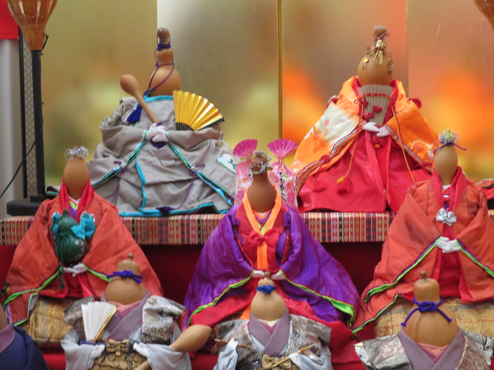 「四季に里」にてお買物休憩。当日は祭りで多くの方がいる。その後「大井町郷土資料館」にてひな祭り開催。瓢箪の町だけあって瓢箪の雛段。