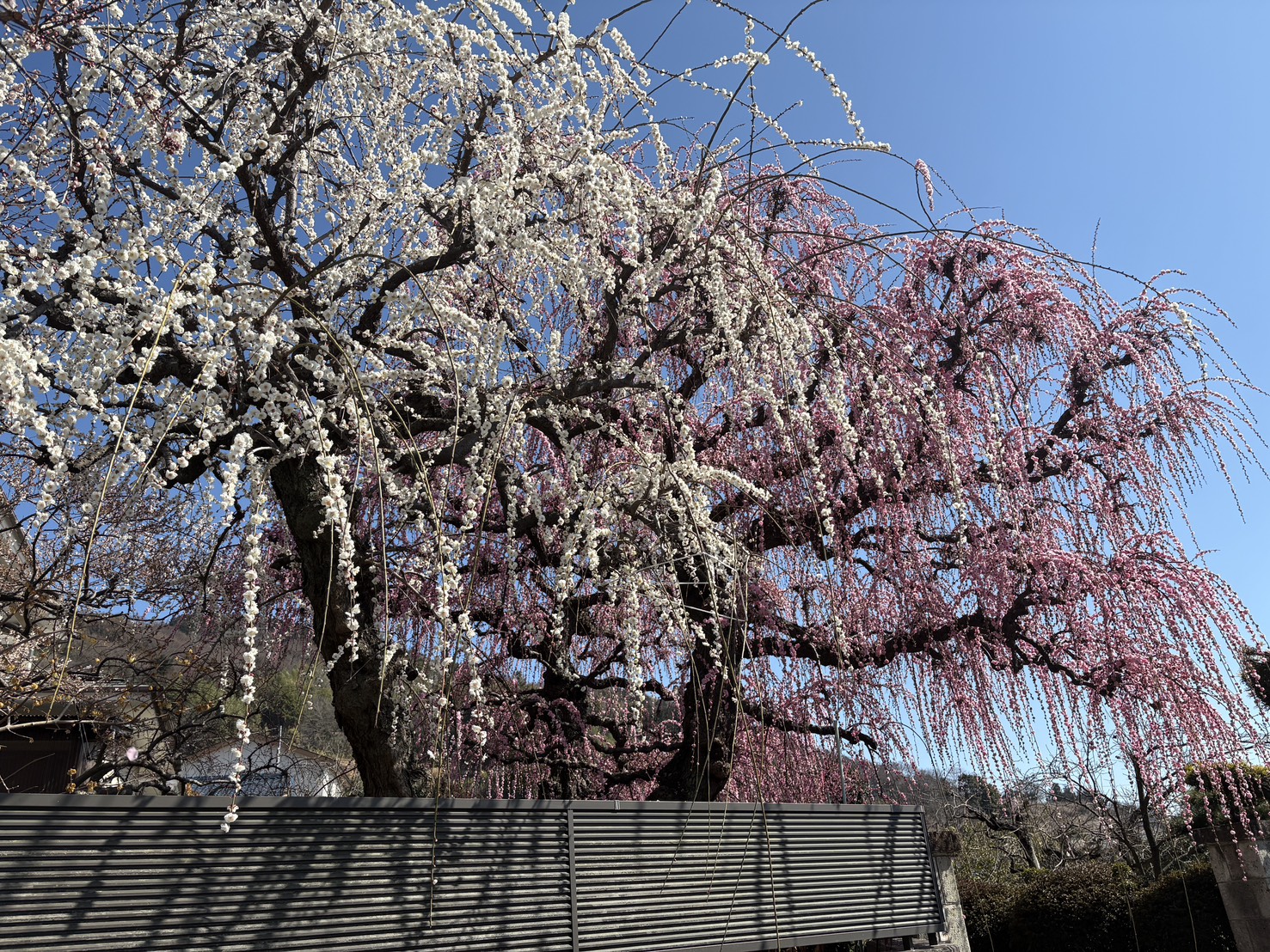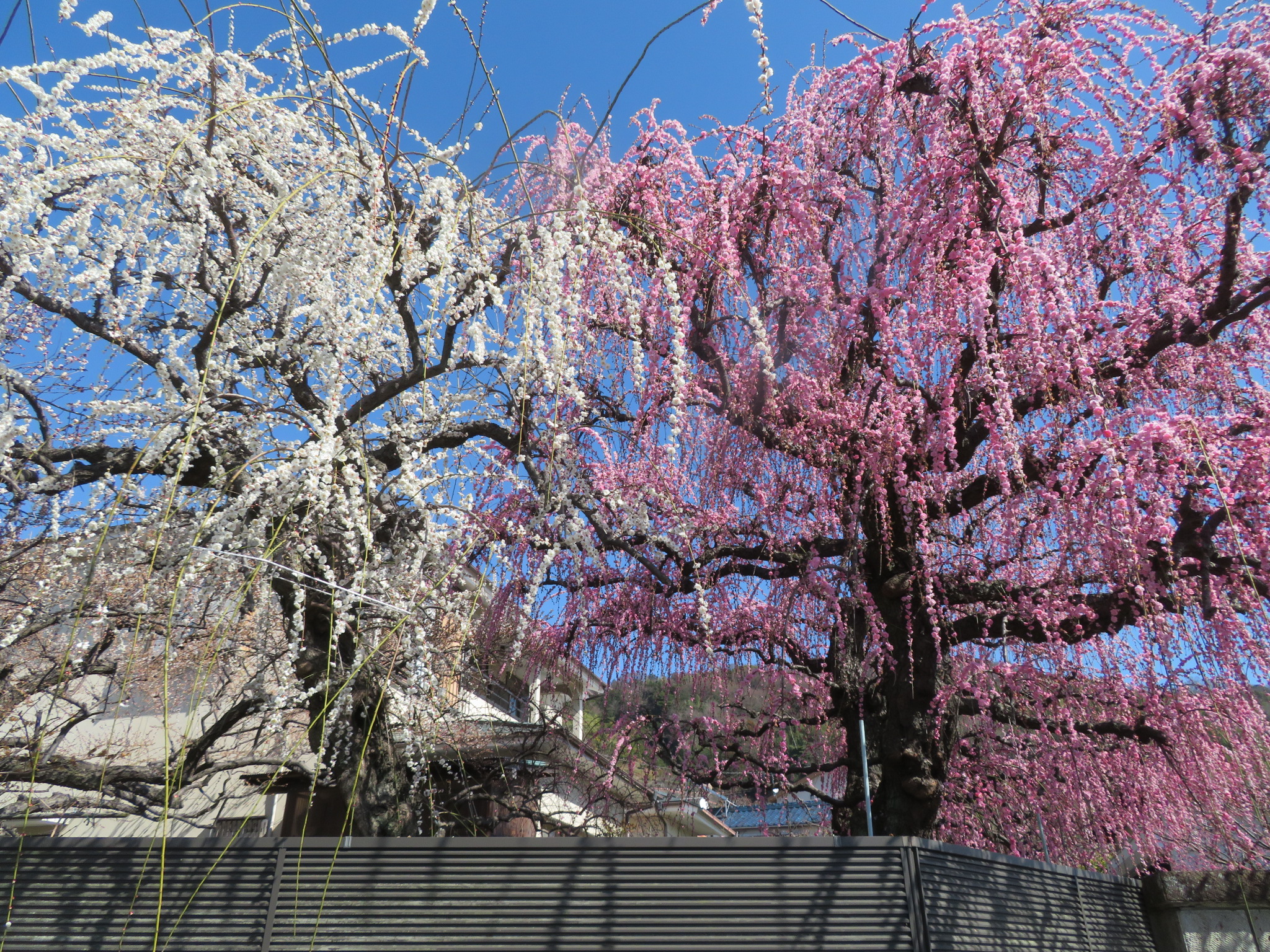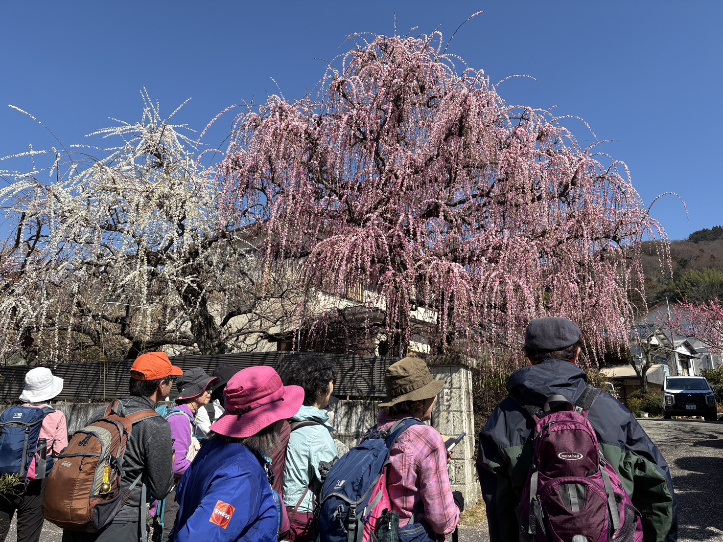 浅間山・不動山を経由して六本松峠で曽我丘陵を下山。暫く車道を下ると72号線に。民家の庭先の紅白枝垂れ梅は満開で見事。