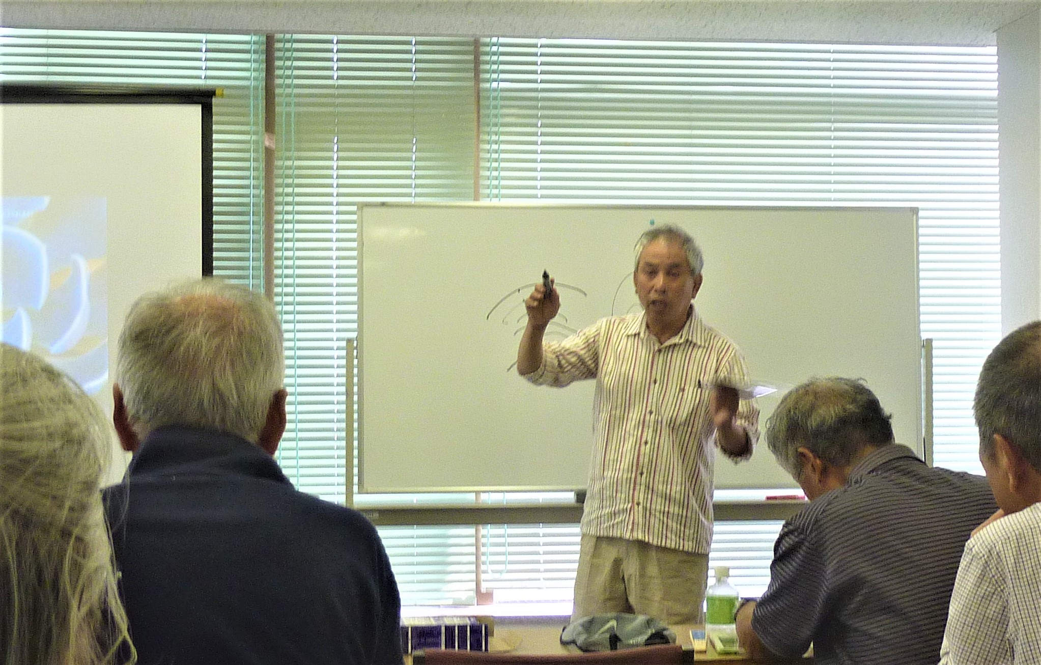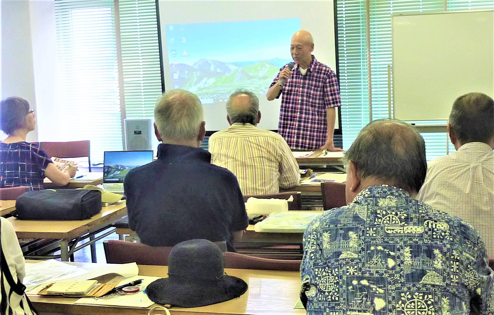第一部は。@「安全な登山と自然」について、14:00〜15:00.井上精司幹事から、以前の大雪山系のトムラウシ山の遭難事故の事例から、山の高度、緯度、風速などによる気温の変化など知り、安全登山の為のリダーの任務、会員の任務、チームワークの大切さについて、また、道に迷ったとき、日が暮れた、雷が近づいたとき、スズメバチ、毒蛇などに出会った時など、対応策などが資料により話されました。